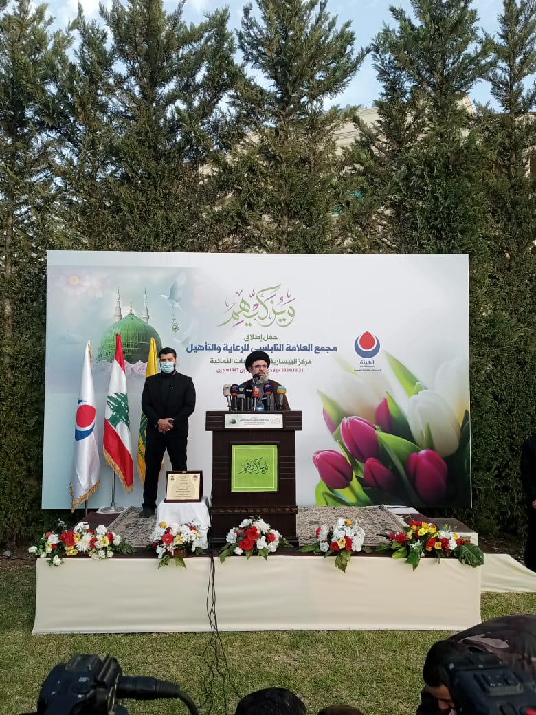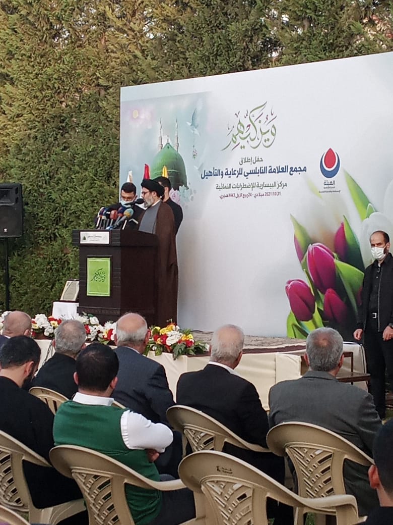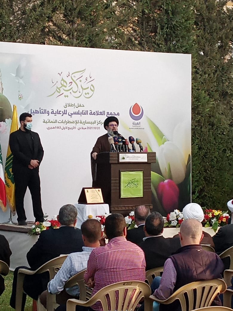 ولو ان حزب الله مهيمن على لبنان لكنت رأيت لبنان آخر ولما كان لكل الطغاة في لبنان والمنطقة والعالم اي كلمة هنا في لبنان ولو كانت كلمة الفصل في لبنان لنا ليس فقط لا نقبل ان يتعدى احد على كرامتنا وأنما الذي ينظر لنا بعين سوف نقلع له عينتاه ولكن مساقبه ليس نحن من يأخذ القرار في البلد. نحن شركاء ولا تضحكوا على العالم اننا نهيمن على لبنان وختم السيد صفي الدين ان الحكومة حاجة وهذه الحكومة يجب أن تقوم بأقل الواجبات بالحد الادنى مما هو فيه ومن يعمل على توجيه الضغوطات والرسائل واختلاق الازمات من أجل أن تفرط هذه الحكومة او من أجل أن تتعطل او من أجل أن يضرب الاستقرار في لبنان او من أجل الضغط بعقوبات اميركية او سعودية او غير ذلك هو الذي يريد أن يخرب لبنان ونحن بذلنا و تحملنا ودمائنا شاهدة على ذلك من أجل ان لا نأخذ بلدنا الى الاقتتال الداخلي وقمنا من اجل ذلك بمعالجة المشاكل الاقتصادية والداخلية للبنانيين والذين يدفعون باختلاق الازمات ازمة امنية هنا وازمة دبلوماسية وازمة سياسية هناك هم الذين يعملون على تخريب لبنان نجل العلامة النابلسي الدكتور الشيخ صادق النابلسي قدم الشكر للامين العام السيد حسن نصرالله على مباركته هذه المبادرة وللسيد صفي الدين على تبنيه ودعمه ورعايته المشروع كما قدم الشكر لكل من واكب و ساهم وقدم المساعدة بدءا من مسؤول منطقة الجنوب الحاج علي ضعون الى الدكتور احمد كحيلان ومسؤوليي منطقتي صيدا والزهراني الشيخ زيد ضاهر والشيخ حسن معتوق وآخرين كثر كانوا خلف الكواليس وتحدث الدكتور النابلسي عن انجازات العلامة النابلسي بدءا من دعمه و احتضانه للمقاومة الاسلامية الى تأسيسه لمجمع الزهراء ومؤسسة الشهيد وجمعية امداد الامام الخميني والقرض الحسن وصولا الى اطلاق المجمع الحالي شاكرا الحضور على مشاركتهم حفل الافتتاح نائب مسؤول وحدة المستشفيات في حزب الله الدكتور احمد كحيل تحدث عن ميزات المشروع مؤكدا ان القرار الحكيم من قيادة حزب الله ليكون هذا الصرح مجمعا لرعاية الاشخاص ذوي الاحتياجات الخاصة يجسد توجه حزب الله لرعاية كافة فئات المجتمع تحديدا الاشخاص ذوي الاحتياجات الخاصة مباركا الايادي البيضاء لعائلة العلامة النابلسي ولقيادة حزب الله لافتا ان هذا الصرح سيكون الامثل والاكمل و متميزا في خدمة اهلنا في كل لبنان يشار الى أن مجمع العلامة النابلسي للرعاية والتأهيل هو الاول من نوعه في منطقة الجنوب.