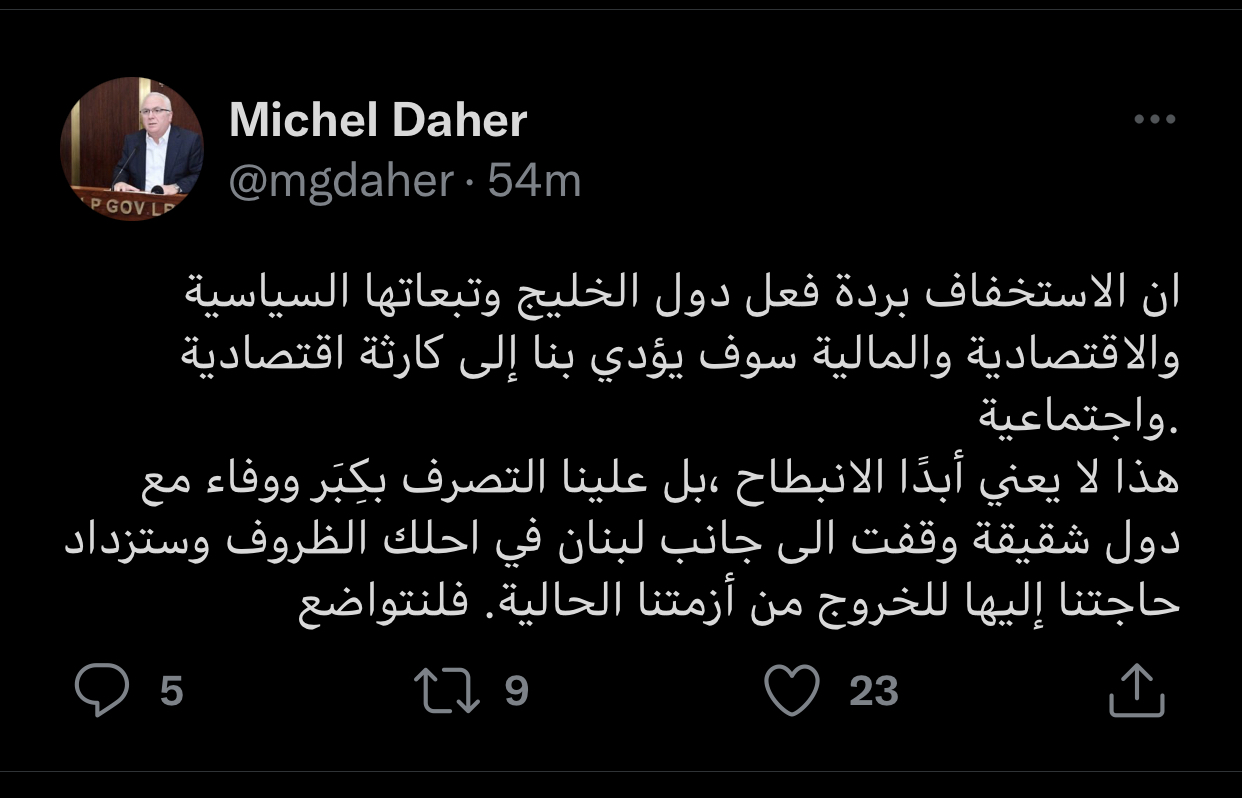 وأشار، في تغريدة عبر حسابه على “تويتر”، أنّ “هذا لا يعني أبدًا الانبطاح، بل علينا التصرف بكِبَر ووفاء مع دول شقيقة وقفت الى جانب لبنان في أحلك الظروف وستزداد حاجتنا إليها للخروج من أزمتنا الحالية”.