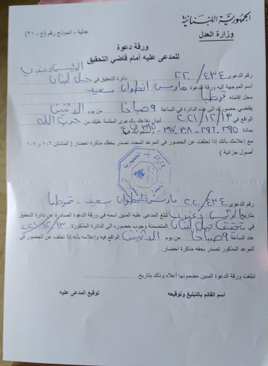 فارس سعيد مطلوب للمثول امام القضاء العسكري