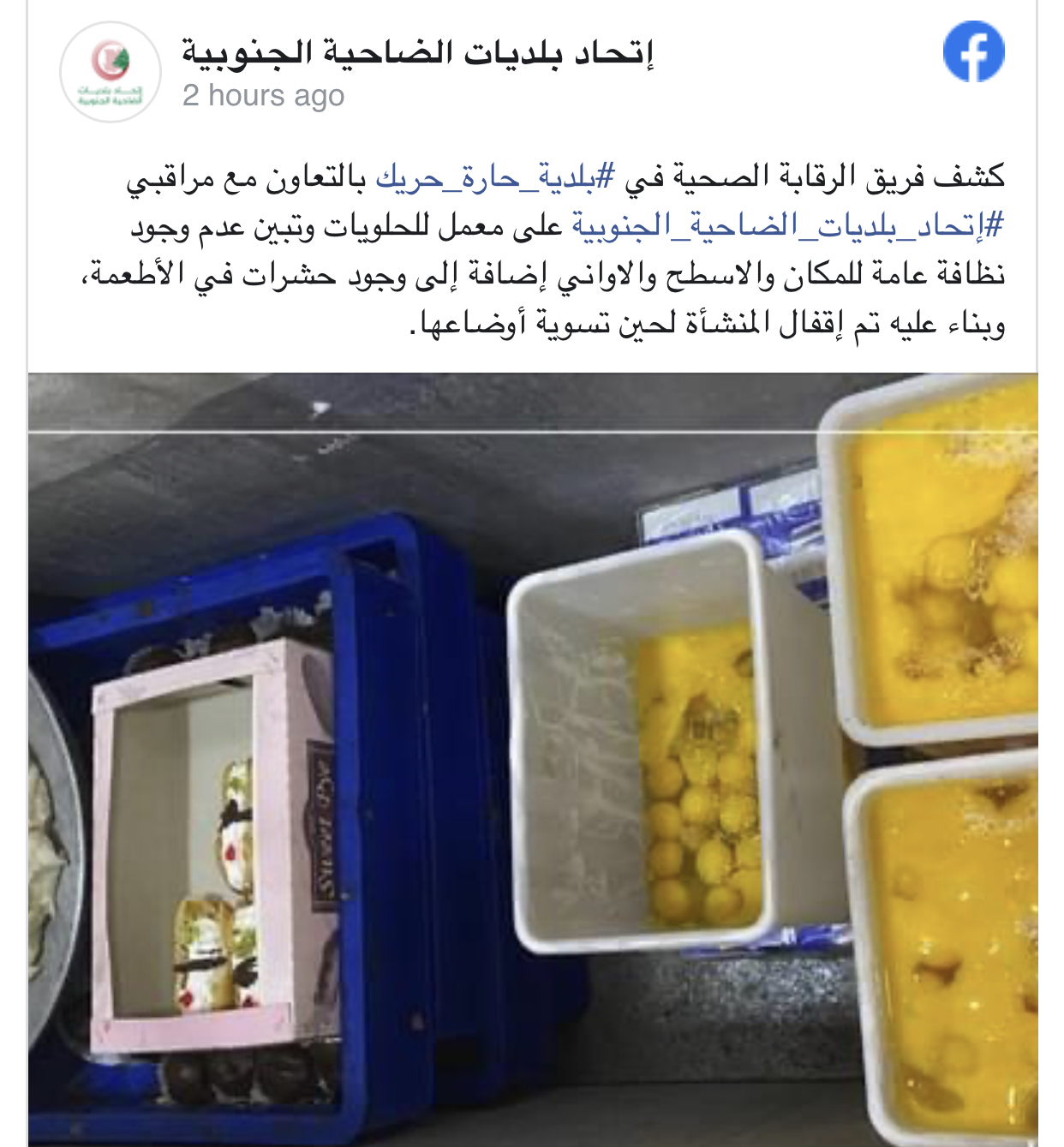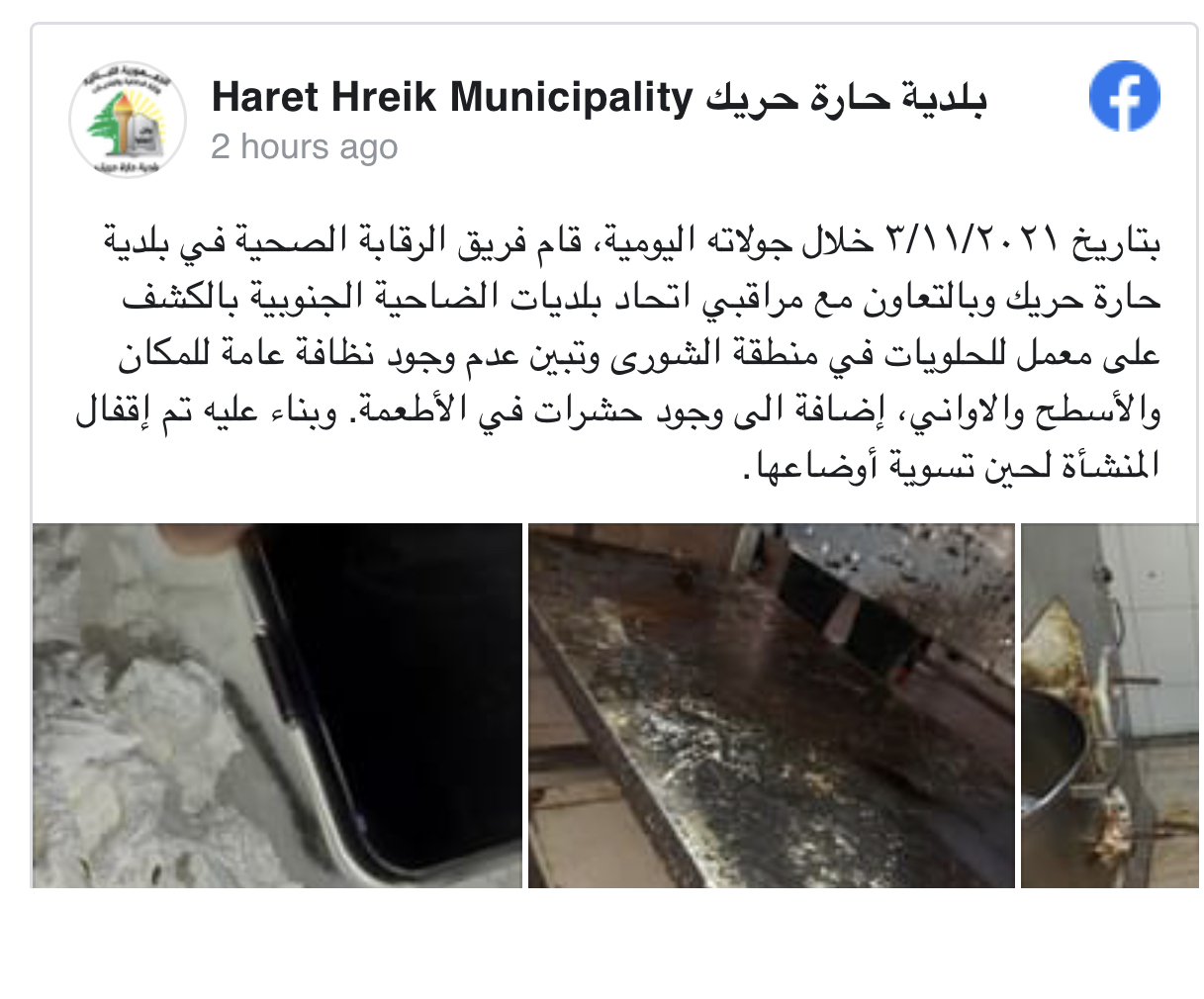 اشارت ” بلدية حارة حريك” في بيان، إلى أنه “بتاريخ ٣/١١/٢٠٢١ خلال جولاته اليومية، قام فريق الرقابة الصحية في بلدية حارة حريك وبالتعاون مع مراقبي اتحاد بلديات الضاحية الجنوبية بالكشف على معمل للحلويات في منطقة الشورى وتبين عدم وجود نظافة عامة للمكان والأسطح والاواني، إضافة الى وجود حشرات في الأطعمة. وبناء عليه تم إقفال المنشأة لحين تسوية أوضاعها.”.