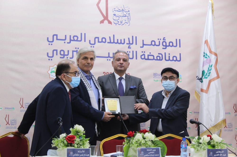 وقبل افتتاح جلسات المؤتمر سلّم معالي القاضي محمد وسام مرتضى بحضور كلٌّ من الدكتور قصير والدكتور مكحّل درع عربون وفاء وتقدير لروح المناضل الدكتور سماح ادريس باسم “المؤتمر الإسلامي العربي لمناهضة التطبيع التربوي” لصديقه ورفيق نضاله والعضو المؤسّس في حركة مقاطعة داعمي إسرائيل في لبنان الدكتور عبد الملك سكّرية.