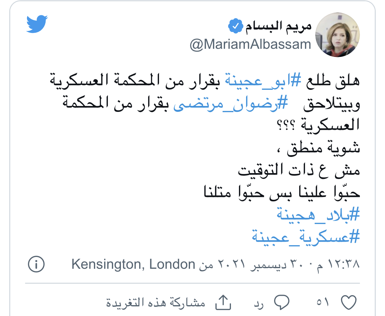 مريم البسام: “هلق طلع أبو عجينة بقرار من المحكمة العسكرية وبيتلاحق رضوان مرتضى بقرار من المحكمة العسكرية.. حبّوا علينا بس حبّوا متلنا”