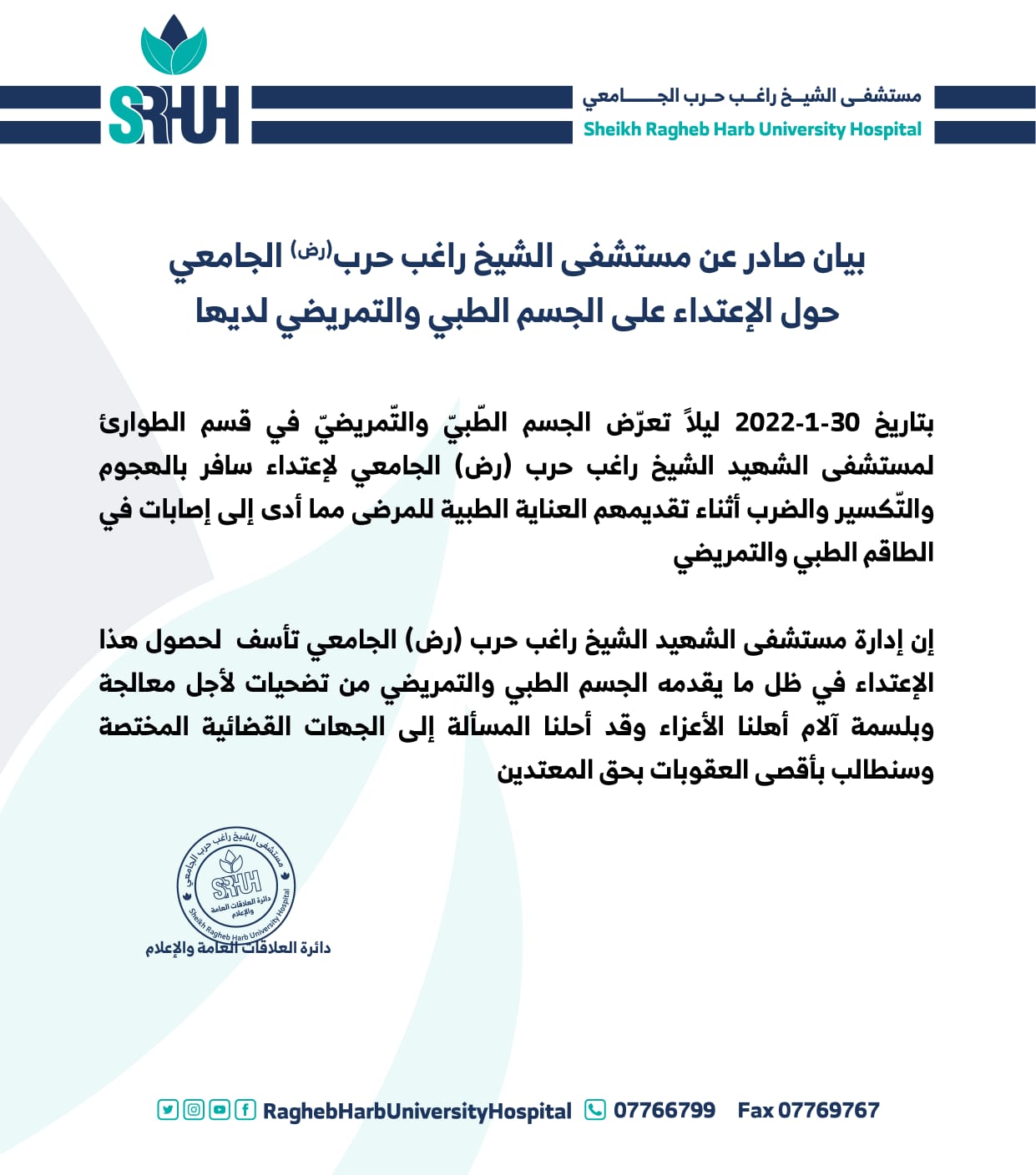 بيان صادر عن مستشفى الشيخ راغب حرب الجامعي حول الإعتداء على الجسم الطبي والتمريضي لديها.