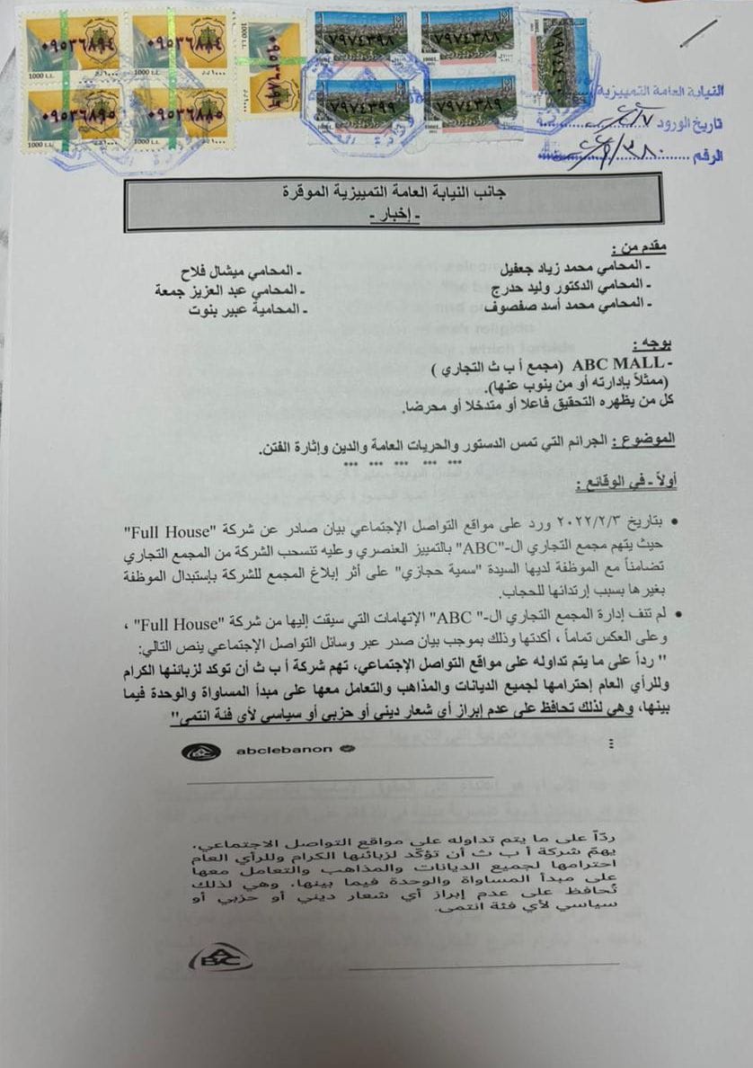 تقدم صباح يوم الإثنين المحامون: محمد زياد جعفيل، وليد حدرج، ميشال فلاح، عبد العزيز جمعة، محمد صفصوف وعبير بنوت بإخبار من جانب النيابة العامة التمييزية في بيروت طالبين الإدعاء على أحد المجمعات التجارية في محلة الأشرفية وإحدى الشركات العاملة داخل المجمع، ليصار الى التحقيق معهما والإدعاء عليهما، ومن يظهره التحقيق فاعلاً أو محرضاً أو شريكاً وتوقيفهم تمهيداً لإحالتهم أمام القضاء المختص بالجرائم الماسة بالدستور والحريات العامة والدين وإثارة الفتن، لاسيما المواد 317 و474 من قانون العقوبات.