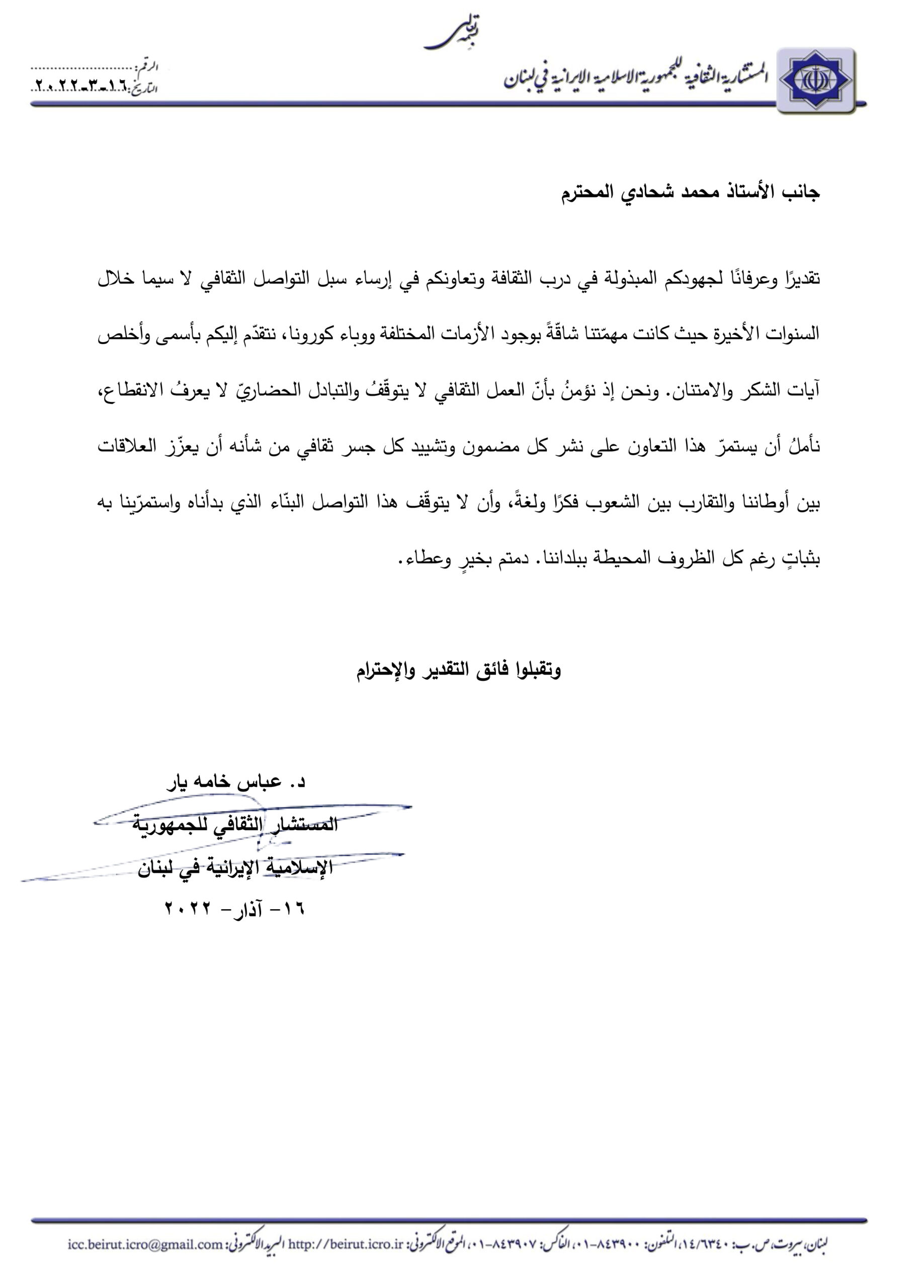رسالة من المستشار الثقافي الإيراني في لبنان “د. عباس خامه يار” إلى مدير موقع هوانا لبنان “محمد شحادي”