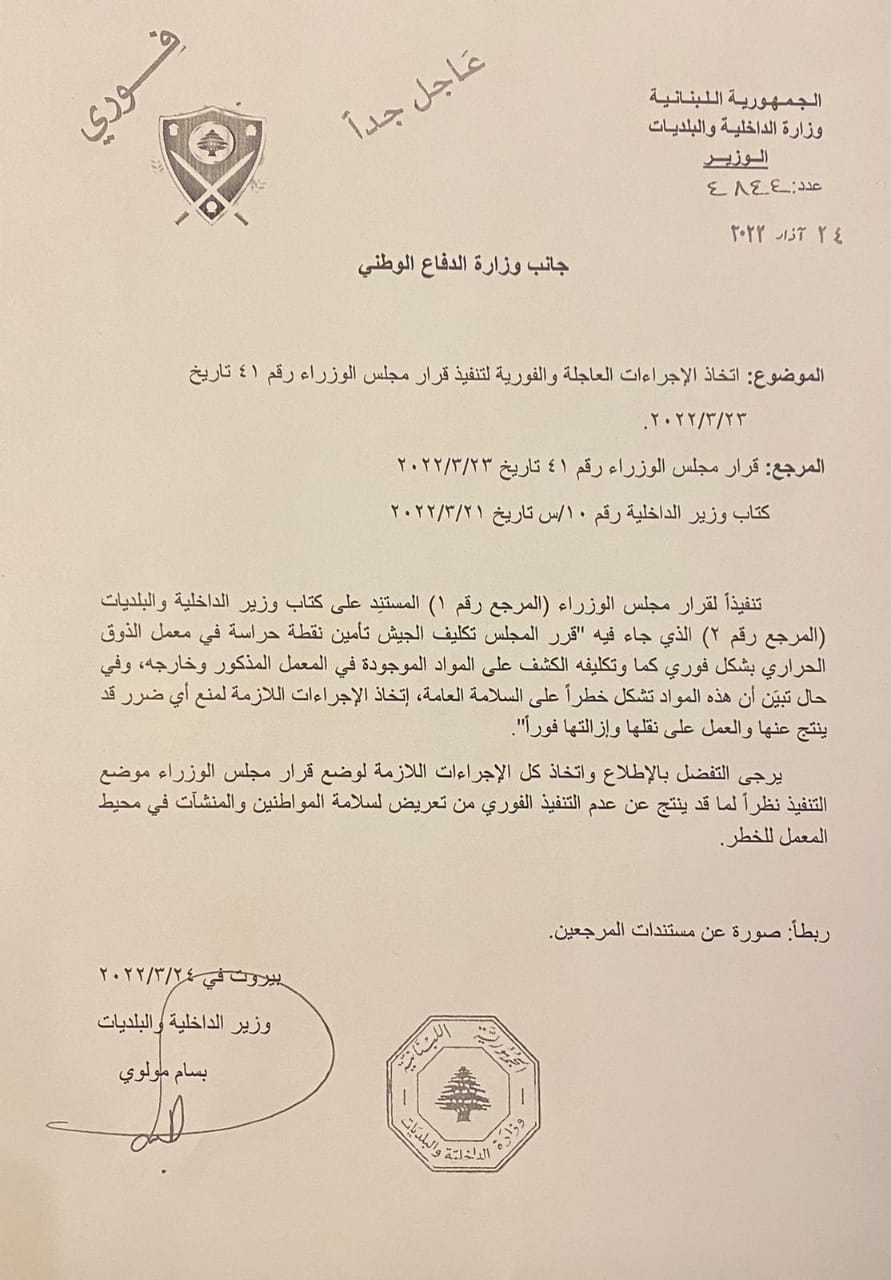 ويهم مكتب وزير الداخلية والبلديات الاشارة الى أن الوزير مولوي طالب مجلس الوزراء بضرورة تأمين الحراسة لمعمل الذوق الحراري وكافة منشآته لحين تمكن إدارة المعمل من استكمال أعمال الصيانة، كما تكليف وزارة الطاقة والمياه المباش