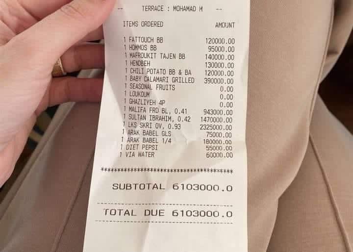 غرّدت الإعلامية نيكول الحجل عبر “تويتر” ناشرةً صورة لفاتورةٍ مطعم في “الزيتونة باي” وجاءت الاسعار صادمة ما استنفرها وأشعل غضبها واستدعى استنكارها فكتبت: “جشع بعض المطاعم في لبنان(وليس كلها!) التي تستفيد من الازمة لتضخيم الاسعار. في مطعم بابل في الزيتونة: كيلو سمك اللقس ٢،٥٠٠،٠٠٠. كيلو سمك السلطان ٣،٥٠٠،٠٠٠. بالدولار اغلى مما كانت قبل الازمة. ضرب القطاع السياحي يجب الا يأتي من اصحابه. هل من رقيب لحماية المقيم والزائر؟”.