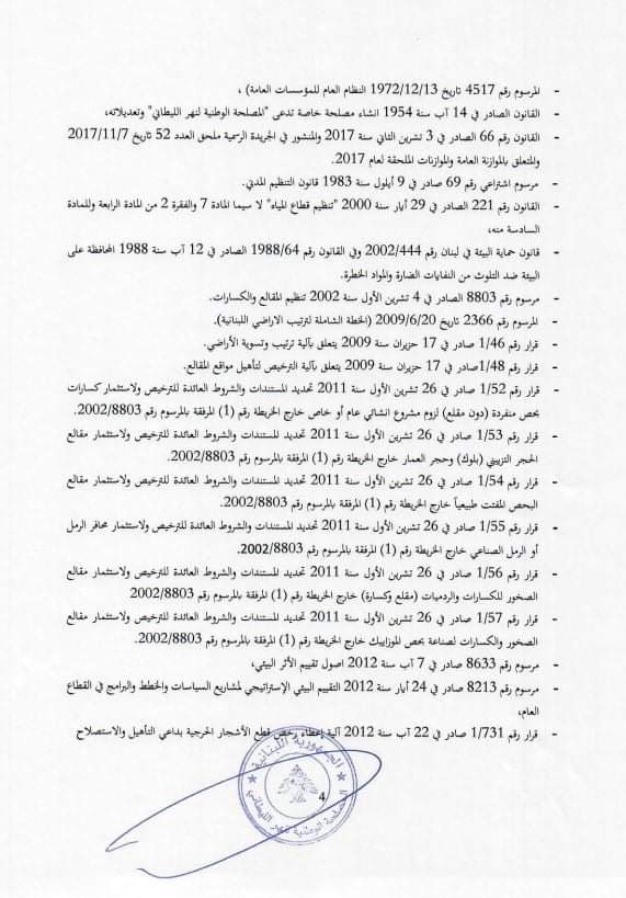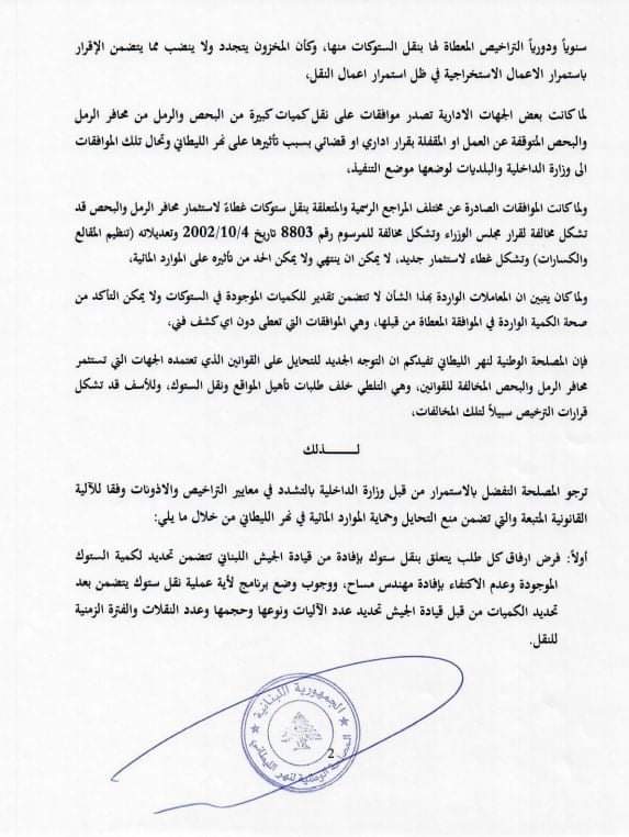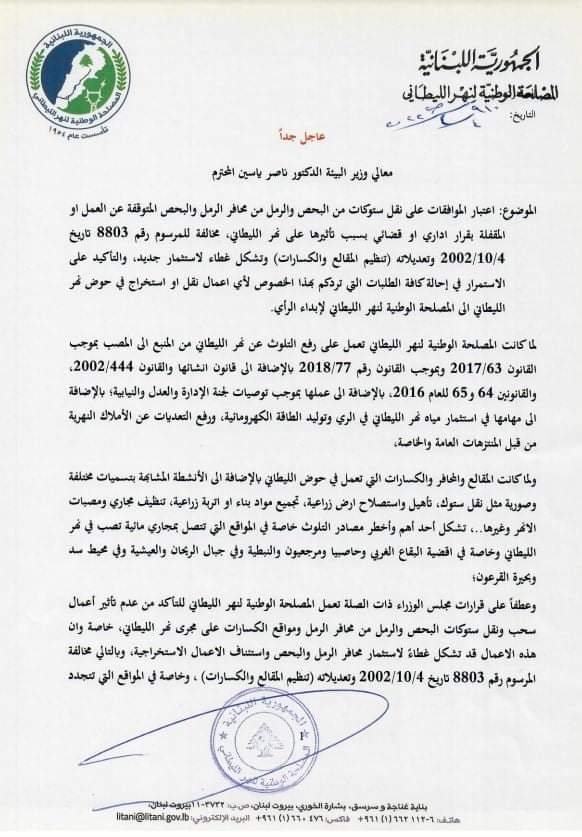 وجهت المصلحة الوطنية لنهر الليطاني، كتابين إلى كل من وزير البيئة ناصر ياسين، ووزير الداخلية والبلديات باسم المولوي، تتضمن التأكيد على التحفظ على كافة الموافقات على نقل ستوكات من البحص والرمل من محافر الرمل والبحص المتوقفة عن العمل أو المقفلة بقرار إداري أو قضائي بسبب تأثيرها على نهر الليطاني، والتأكيد على الاستمرار في إحالة كافة الطلبات التي ترد عن أي أعمال نقل أو استخراج في حوض نهر الليطاني إلى المصلحة الوطنية لنهر الليطاني لإبداء الراي.
