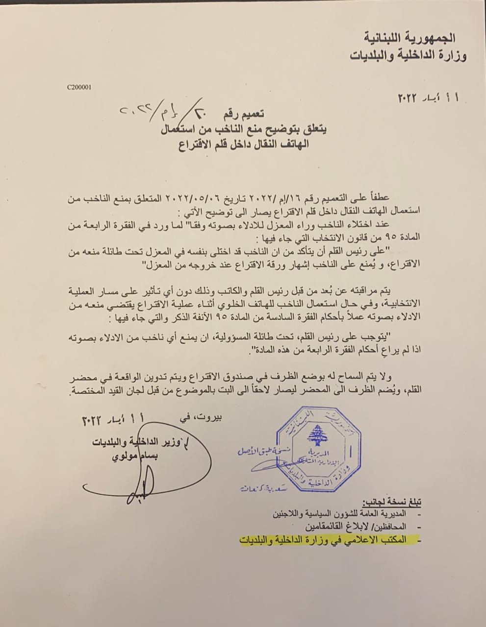أصدر وزير الداخلية والبلديات القاضي بسام مولوي تعميماً يتعلق بتوضيح حول منع الناخب من استعمال الهاتف النقال داخل قلم الاقتراع.