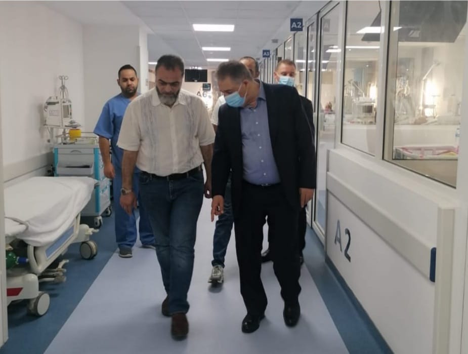 ثم جال مطمئناً على كافة المرضى في قسمي العناية الفائقة والعناية القلبية وباقي أقسام المستشفى متفقداً سير العمل بداخلها.