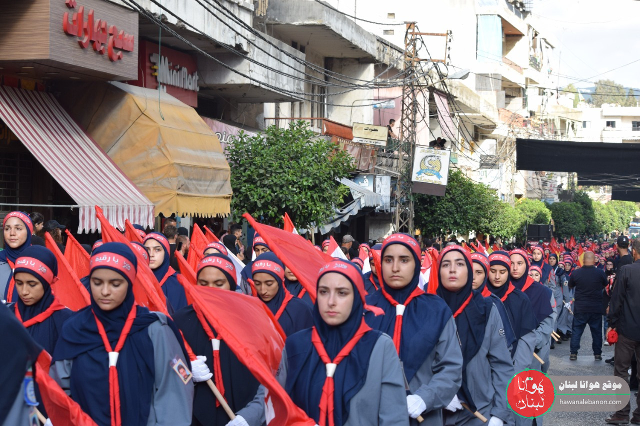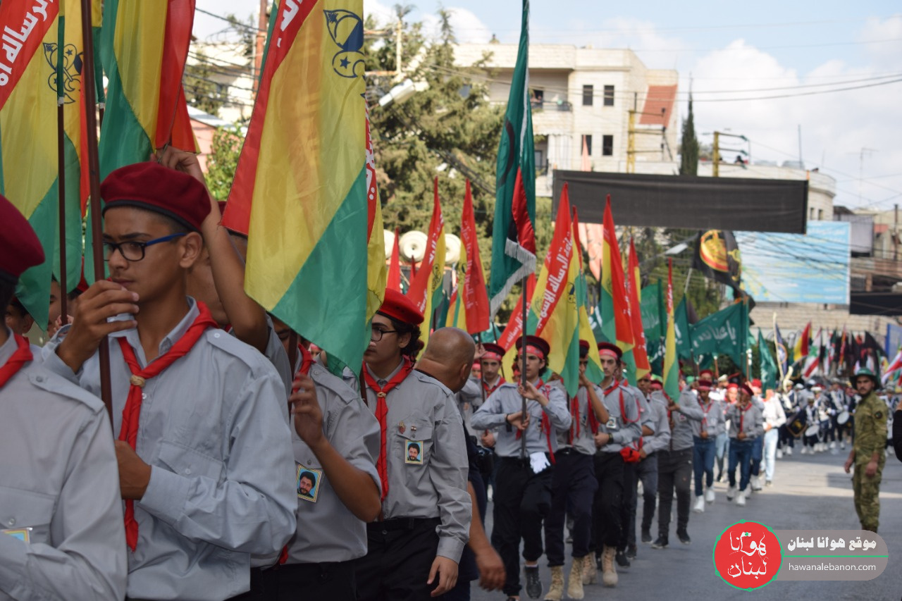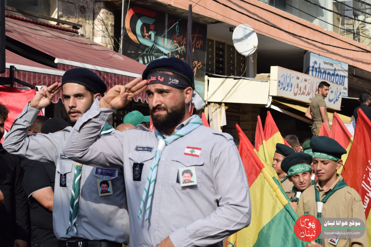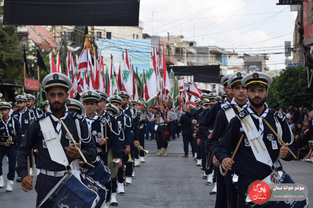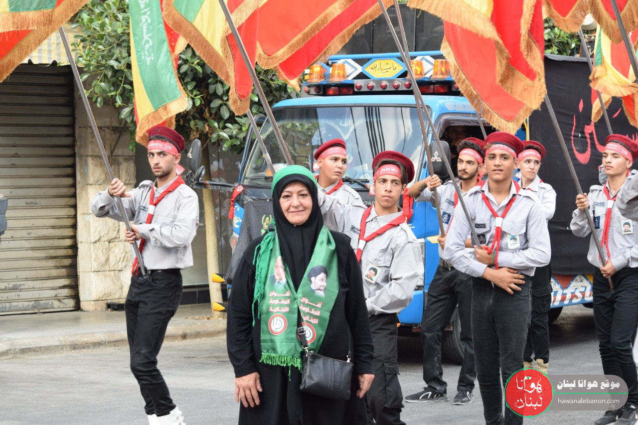 المسيرة انطلقت من أمام دوار المنشية في المدينة يتقدمها فرق رمزية من قادة الأفواج الكشفية والجوالة في كشافة الرسالة الاسلامية والمرشدات والدليلات والزهرات وعناصر من جمعية الرسالة للاسعاف الصحي والمسعفين والمسعفات في الجمعية وحملة الرايات الحسينية والاعلام اللبنانية وحركة امل وكشافة الرسالة الاسلامية والمجسمات العاشورائية ثم امهات الشهداء ومكتب شؤون المرأة في الحركة ثم فرق اللطيمة الذين ارتدوا زيا يجسد علم افواج المقاومة اللبنانية أمل بحضور النائبين قبلان قبلان وهاني قبيسي ، عضو هيئة الرئاسة في حركة امل خليل حمدان، رئيس المكتب السياسي في الحركة جميل حايك، عضو الهيئة التنفيذية في الحركة احمد بعلبكي، امام مدينة النبطية الشيخ عبد الحسين صادق، المسؤول التنظيمي المركزي في الحركة يوسف جابر، مفوض عام كشافة الرسالة قاسم عبيد واعضاء المفوضية في الجمعية، المسؤول التنظيمي لاقليم الجنوب في الحركة نضال حطيط واعضاء قيادة الاقليم، وعدد من اعضاء المكتب السياسي والهيئة التنفيذية في الحركة، محافظ النبطية بالوكالة حسن فقيه، رئيس اتحاد بلديات الشقيف محمد جميل جابر، رئيس اتحاد ساحل الزهراني علي مطر ، رئيس بلدية النبطية الدكتور احمد كحيل، وفد من حزب البعث العربي الاشتراكي، قائد سرية قوى الامن الداخلي في محافظة النبطية العقيد توفيق نصرالله، لفيف من رجال الدين وفعاليات بلدية واختيارية وحشود شعبية من اقضية النبطية واقليم التفاح ومرجعيون وساحل الزهراني.