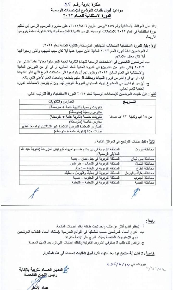 الإمتحانات الرسمية المتوسطة والثانوية بفروعها الأربعة لدورة ٢٠٢٢ الإستثنائيةوفقاً لترتيب التالي: