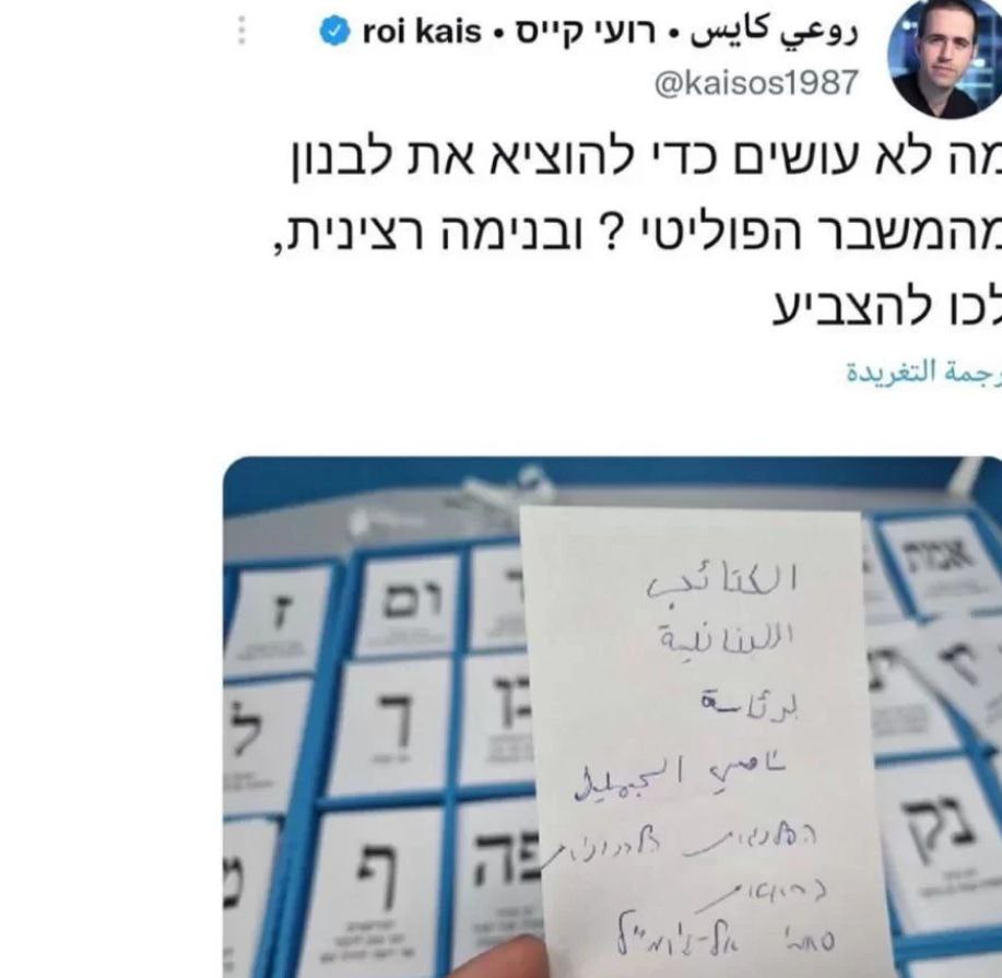 نشر روعي كايس، مراسل الشؤون العربية في قناة كان العبرية، صورة لورقة اقتراع مكتوب فيها الكتائب اللبنانية برئاسة “سامي الجميل” من انتخابا
