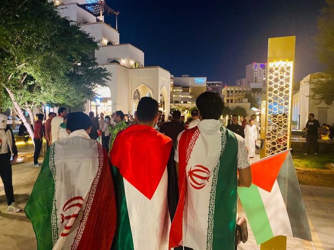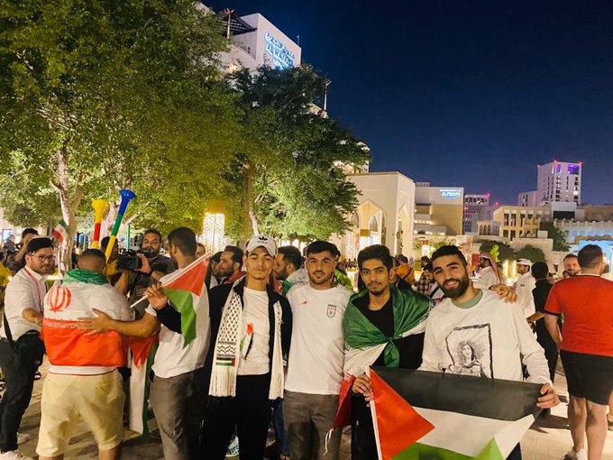 الجمهور الفلسطيني في الدوحة ينظم وقفة دعم لمنتخب ايران في مباراته المرتقبة مع نظيره الاميركي ضمن فعاليات مونديال قطر.