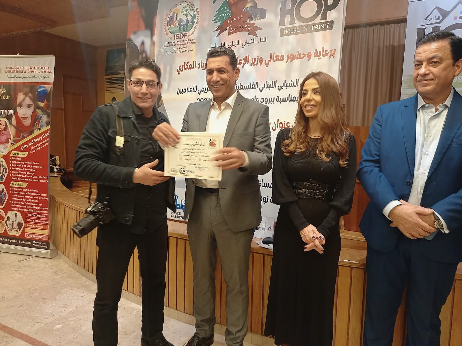 في الختام، وزعت الدروع وشهادات التقدير على المكرمين، ومن بينهم الزميل المصور الصحافي خالد عياد.