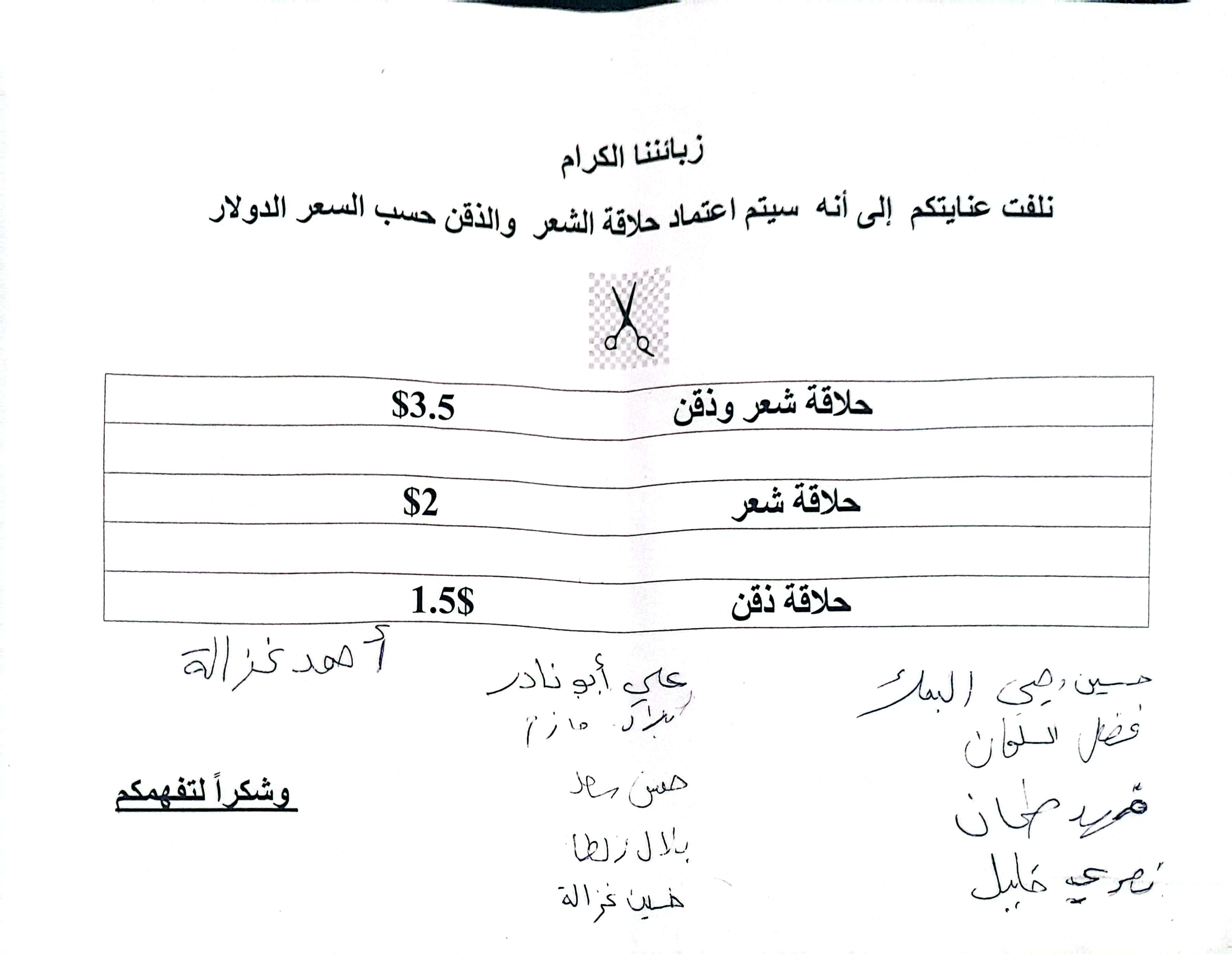 بالتزامن مع ارتفاع سعر صرف الدولار في السوق السوداء، صدر عن تجمّع بعض اصحاب صالونات الحلاقة في بلدة عدلون تسعيرة جديدة جاءت على الشكل التالي: