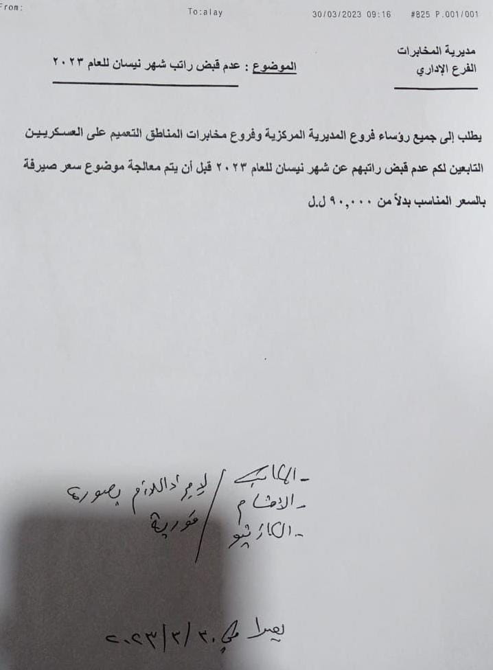 صدرت برقية من قيادة الجيش إلى جميع العسكريين لعدم تقاضي معاشات آخر الشهر بإنتظار تعميم سيصدر عن مصرف لبنان اليوم ليحدّد فيه سعر صيرفة للقطاع العام