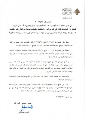 أصدر رئيس حكومة تصريف الأعمال نجيب ميقاتي تعميماً إلى الإدارات العامة والمؤسسات العامة والبلديات بشأن إبلاغ رئاسة مجلس الوزراء نسخة عن المراسلات كافة التي تتمّ مع الدول والمنظمات والهيئات الدولية في الخارج، كما والتنسيق المسبق مع وزارة الخارجية والمغتربين عن ترشيح شخصيات لبنانية الى مناصب في منظمات دولية.