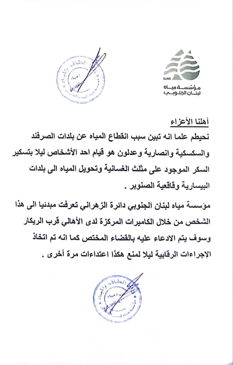 أهلنا الأعزاء .. نحيطكم علماً انه تبين سبب انقطاع المياه في بلدات الصرفند والسكسكية وانصارية وعدلون هو قيام أحد الاشخاص ليلاً بتسكير السكر الموجود على مثلث الغسانية وتحويل المياه الى بلدات البيسارية وقاعقعية الصنوبر.
