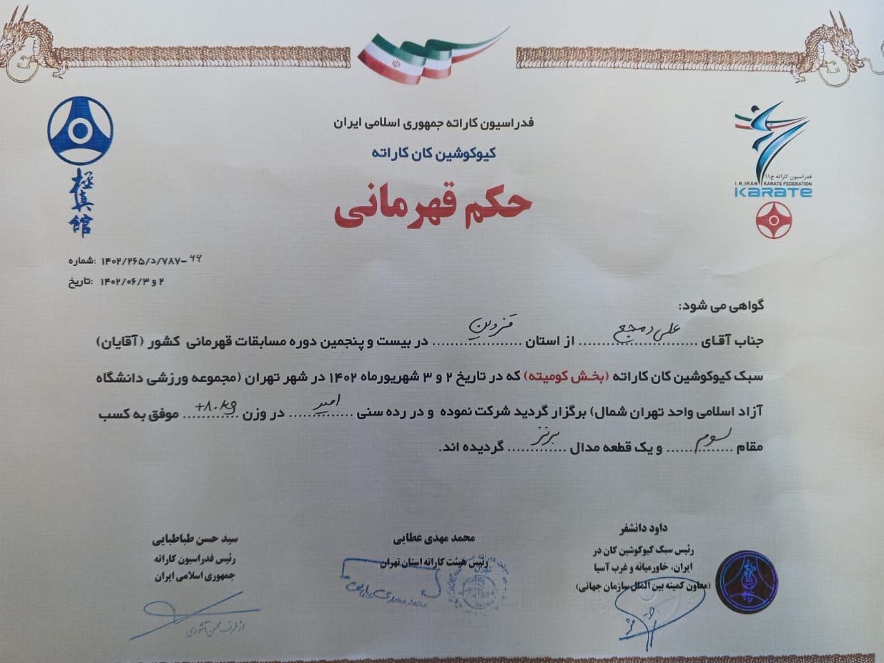 الشاب اللبناني “علي دمج” يحصد المركز الثالث في لعبة الكيوكوشنكاي في بطولة على مستوى إيران