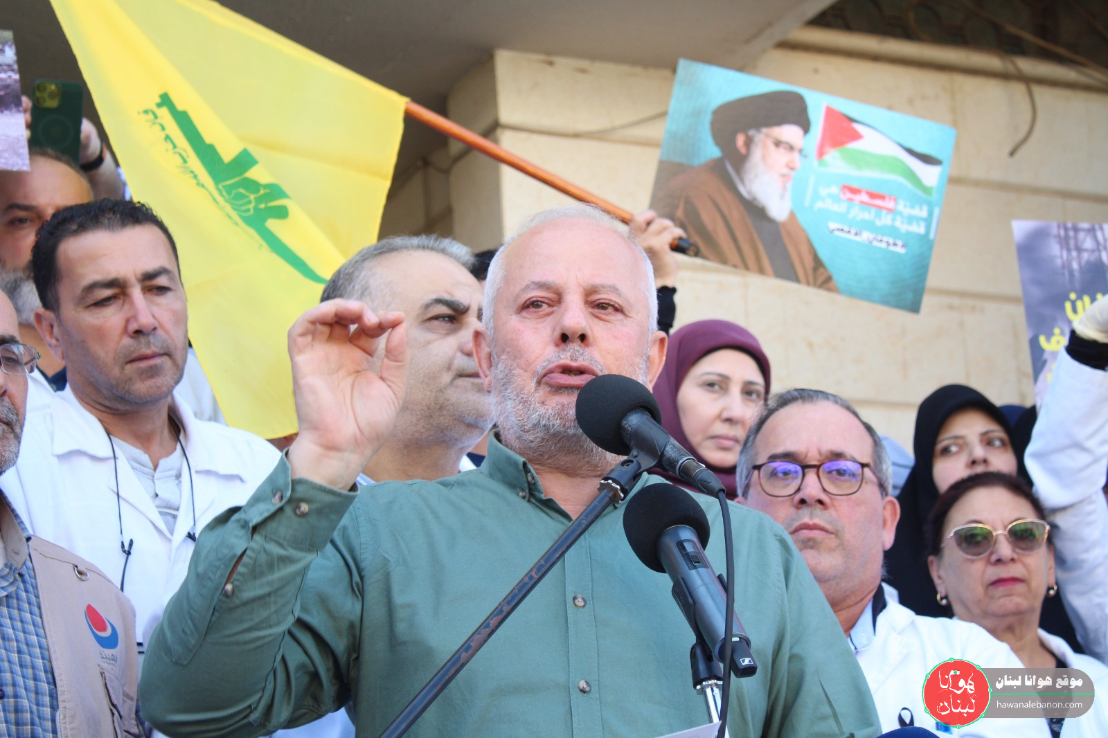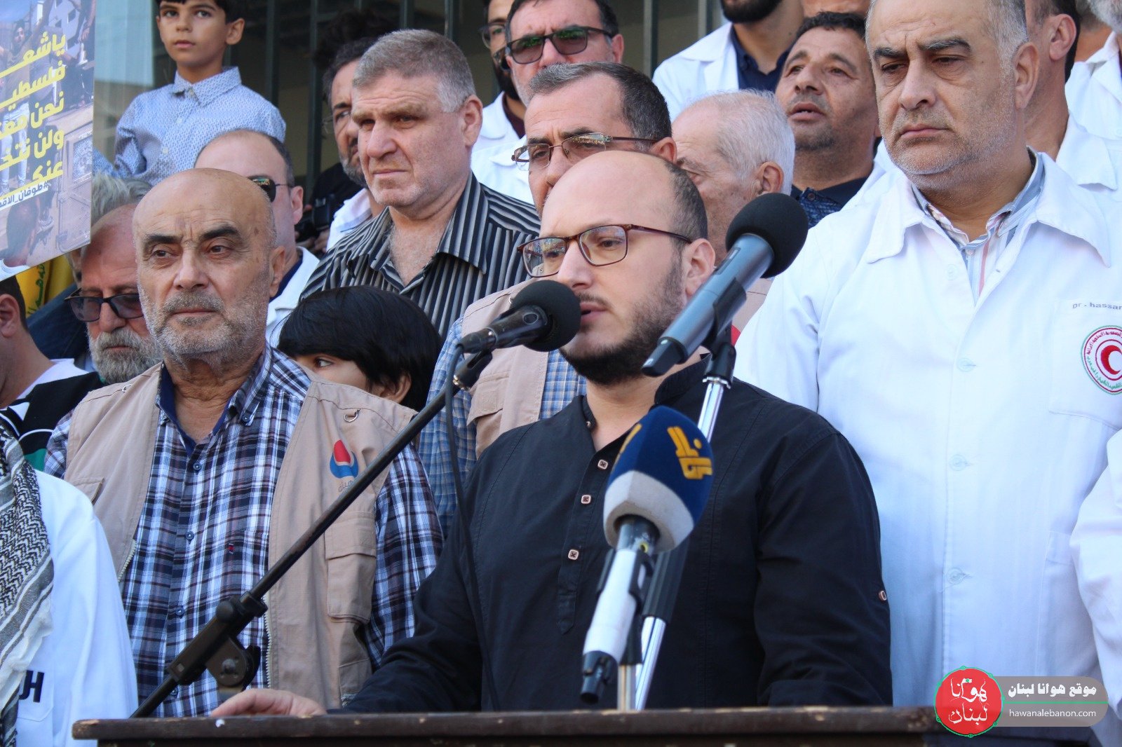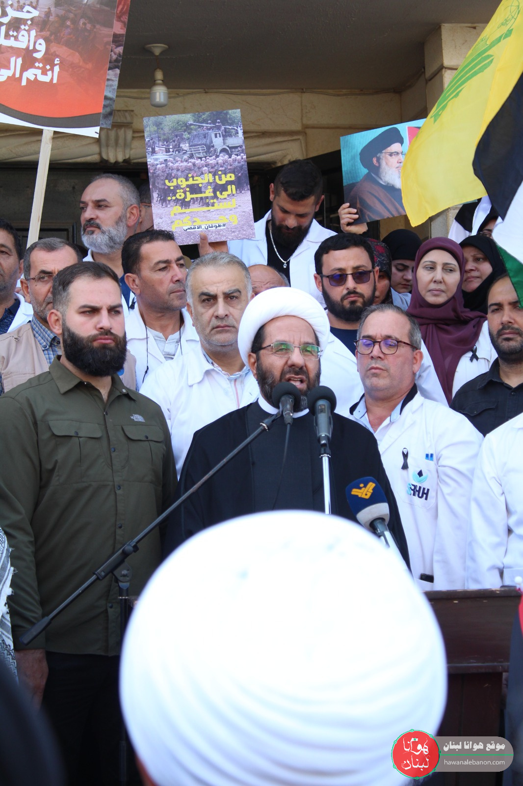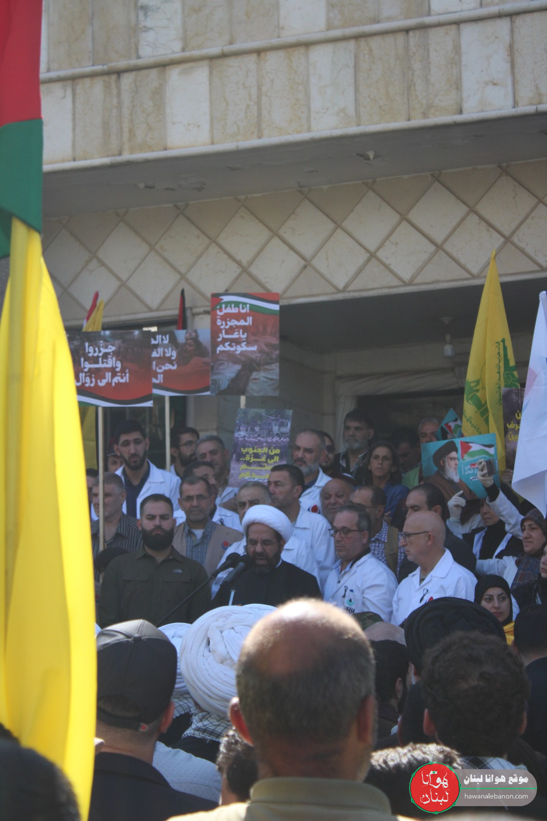 تضامناً مع غزة الصمود، واستنكاراً للمجازر الاسرائيلية الوحشية بحق الاطفال والعزل واخرها مجزرة مستشفى المعمداني، نظم الجسم الطبي والتمريضي في الهيئة الصحية مستوصف الجنوب في مدينة النبطية وقفة تضامنية امام المستوصف بمشاركة الشيخ علي دعموش ومسؤول المنطقة الثانية الحاج علي ضعون، وجمع كبير من الأطباء والممرضين والعلماء وحشد من أهالي المنطقة، حيث رفعوا جميعا الاعلام الفلسطينية.