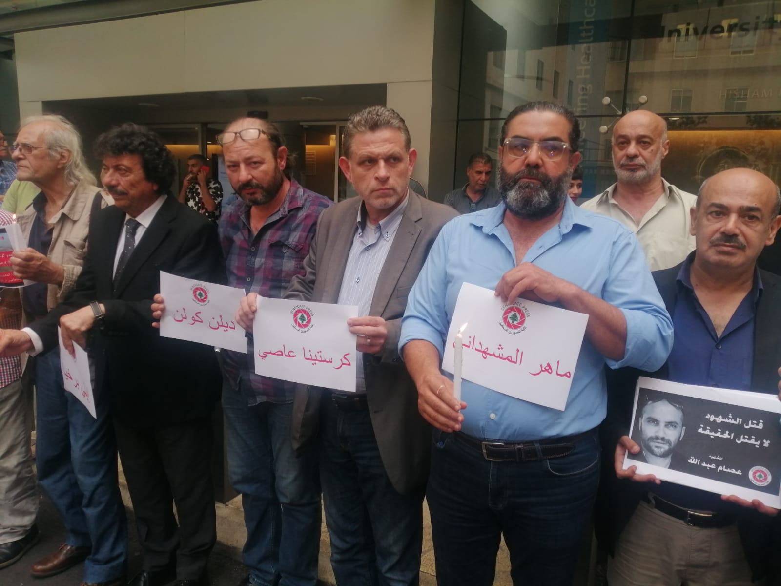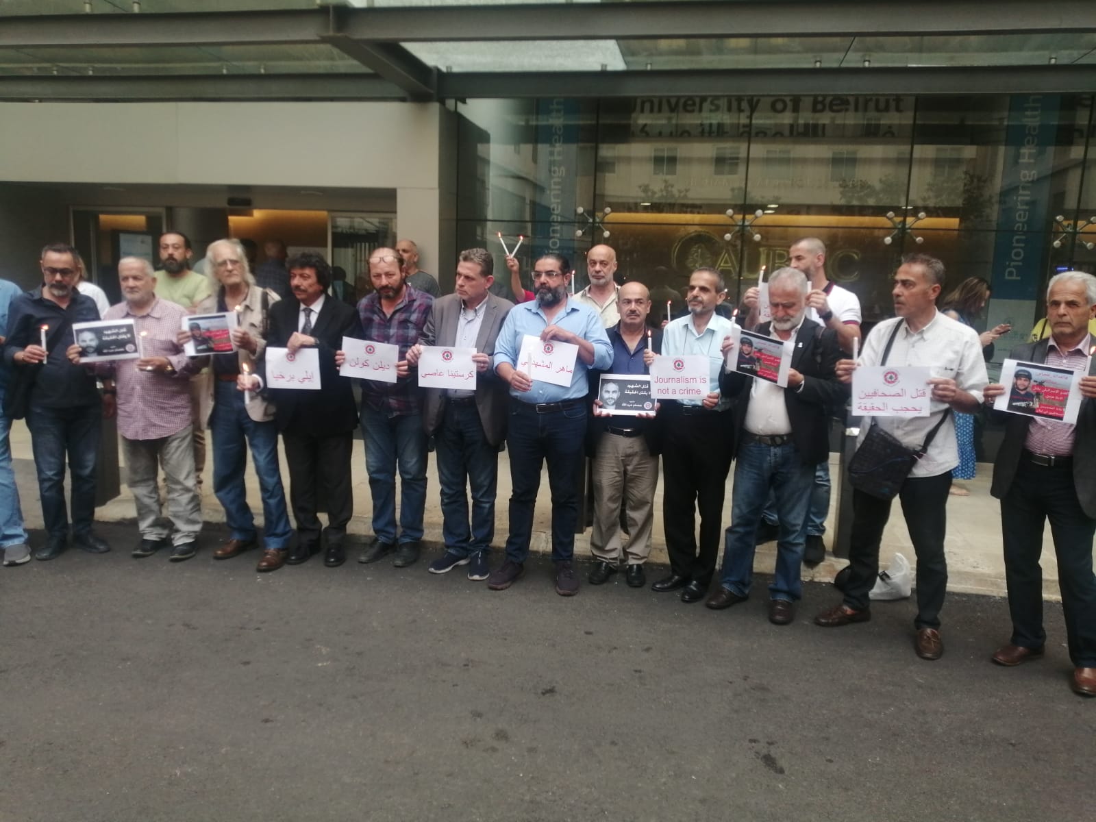 وقفة تضامنية لنقابة المصورين الصحفيين في لبنان امام الجامعة الامريكية على نية شفاء الجرحى واستنكارا لأعمال العدو الهمجية بقتل الأبرياء والصحافيين تخللها اناره شموع.