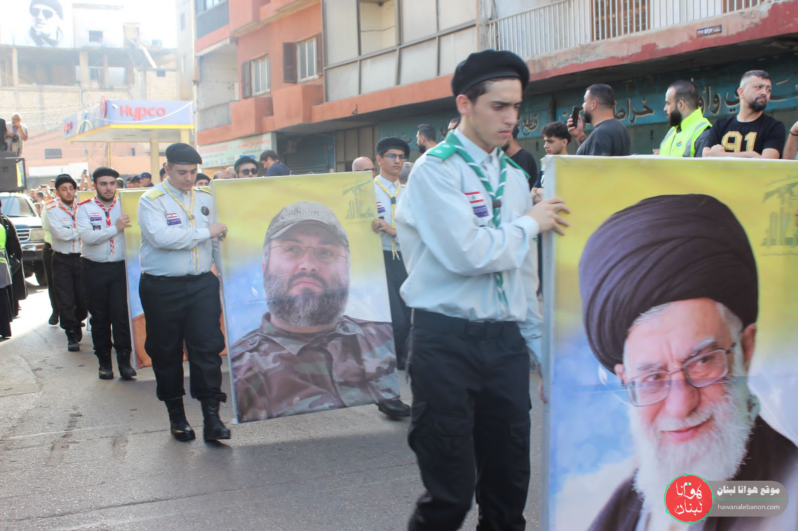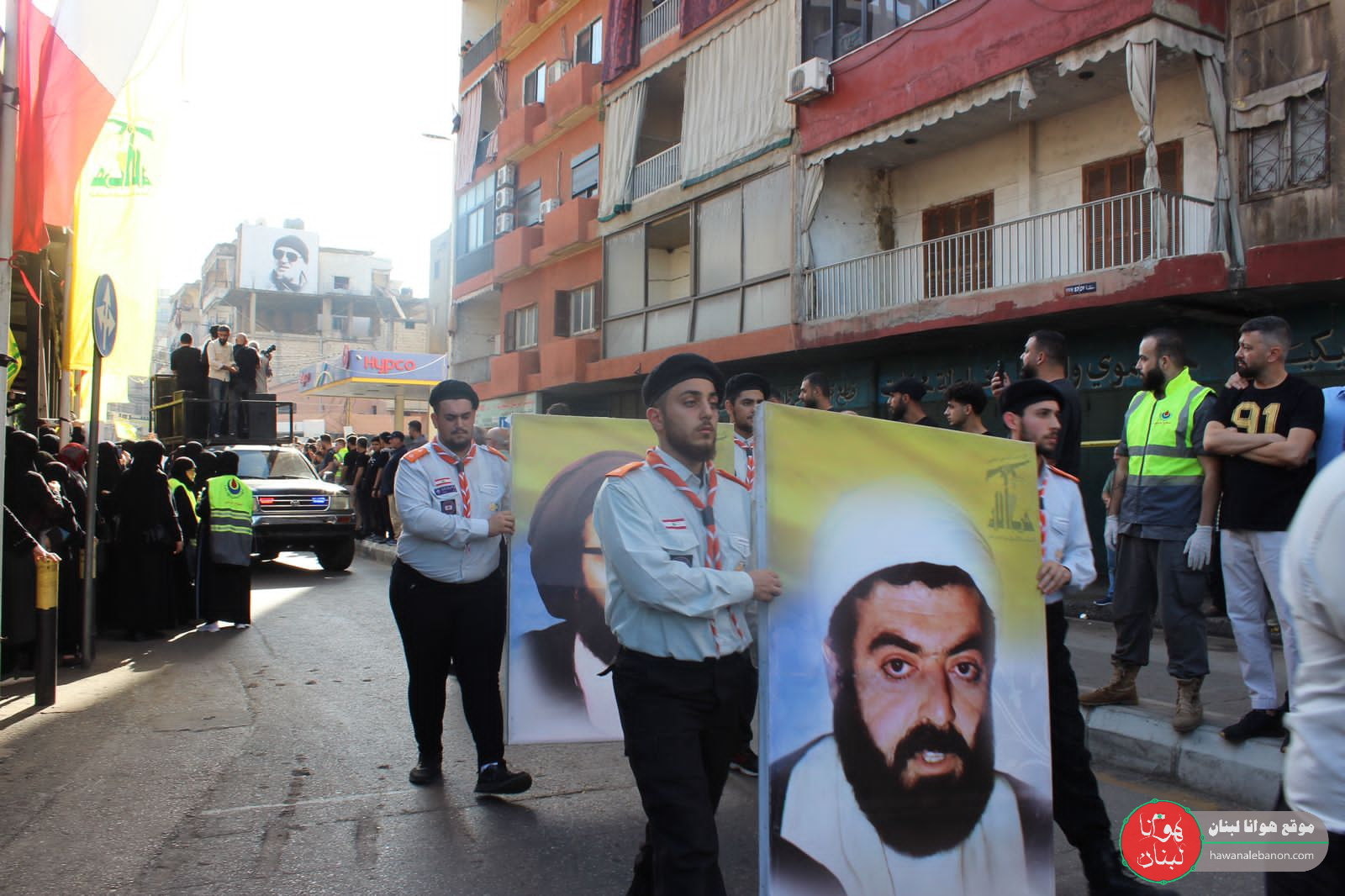 وأنتظم المشيعون في موكب مهيب تقدمه حملة الاعلام اللبنانية ورايات المقاومة وصور للامام الخميني والسيد الخامنئي والامام السيد موسى الصدر وللسيد حسن نصرالله وصور لشهداء وقادة المقاومة، اضافة الى صورة عملاقة للشهيد وحملة الاكاليل وفرق من كشاف الامام المهدي.