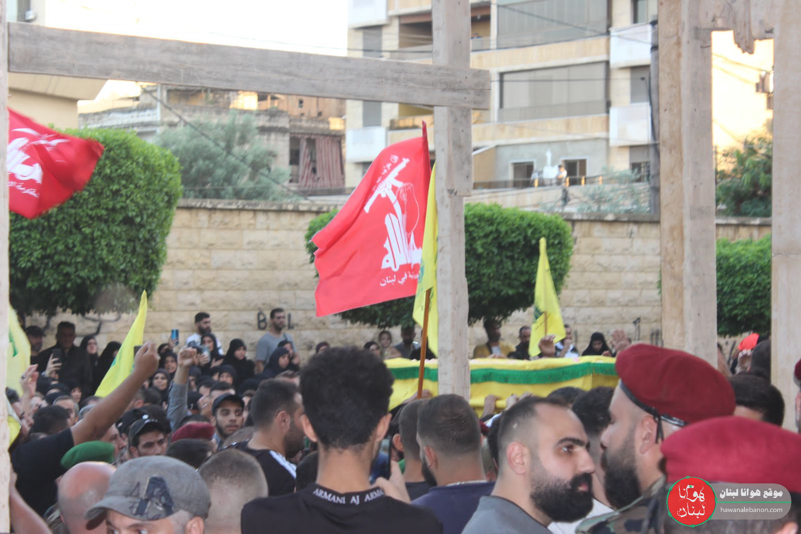 وانطلق موكب التشييع من منزل ذوي الشهيد وحمل الجثمان على الاكف وقد لف براية “حزب الله”.