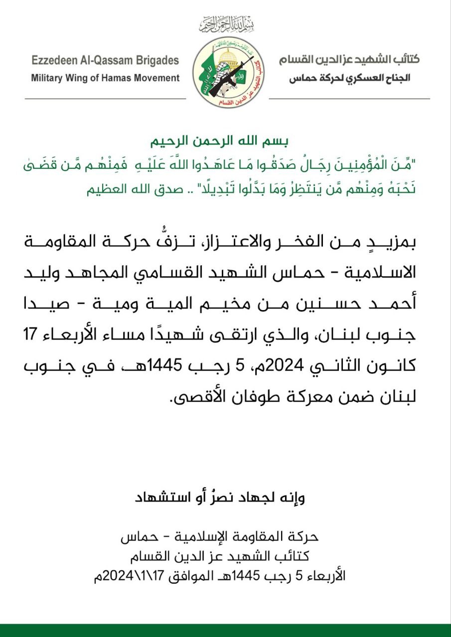بمزيدٍ من الفخر والاعتزاز، تزفُّ حركة المقاومة الاسلامية – حماس الشهيد القسامي المجاهد وليد أحمد حسنين من مخيم المية ومية – صيدا جنوب لبنان، والذي ارتقى شهيدًا مساء الأربعاء 17 كانون الثاني 2024م، 5 رجب 1445هـ، في جنوب لبنان ضمن معركة طوفان الأقصى.