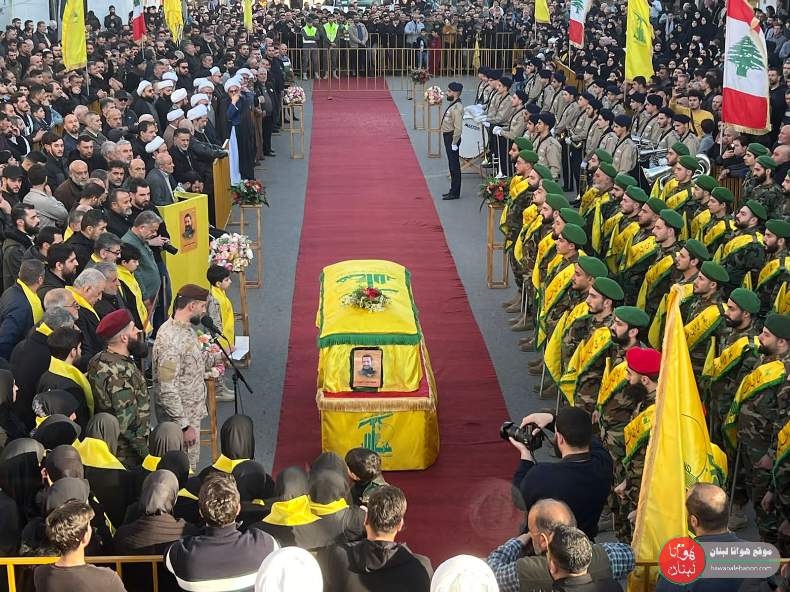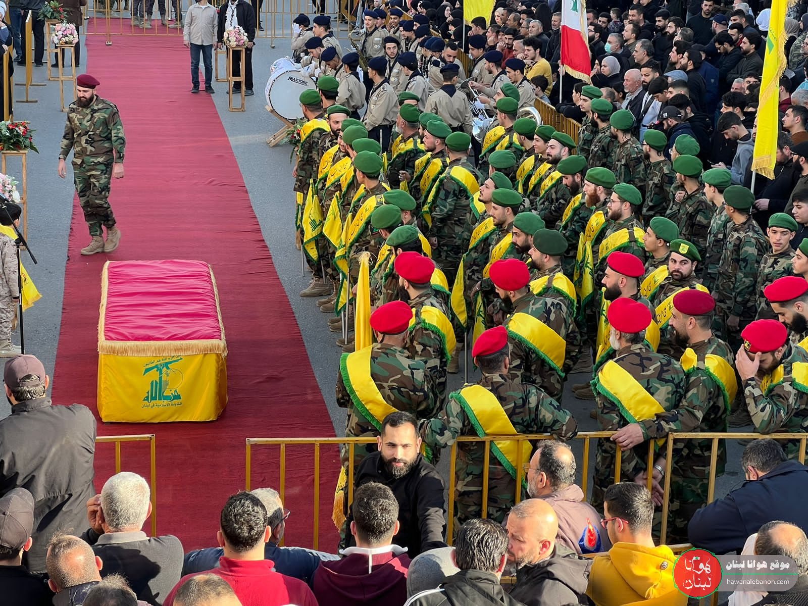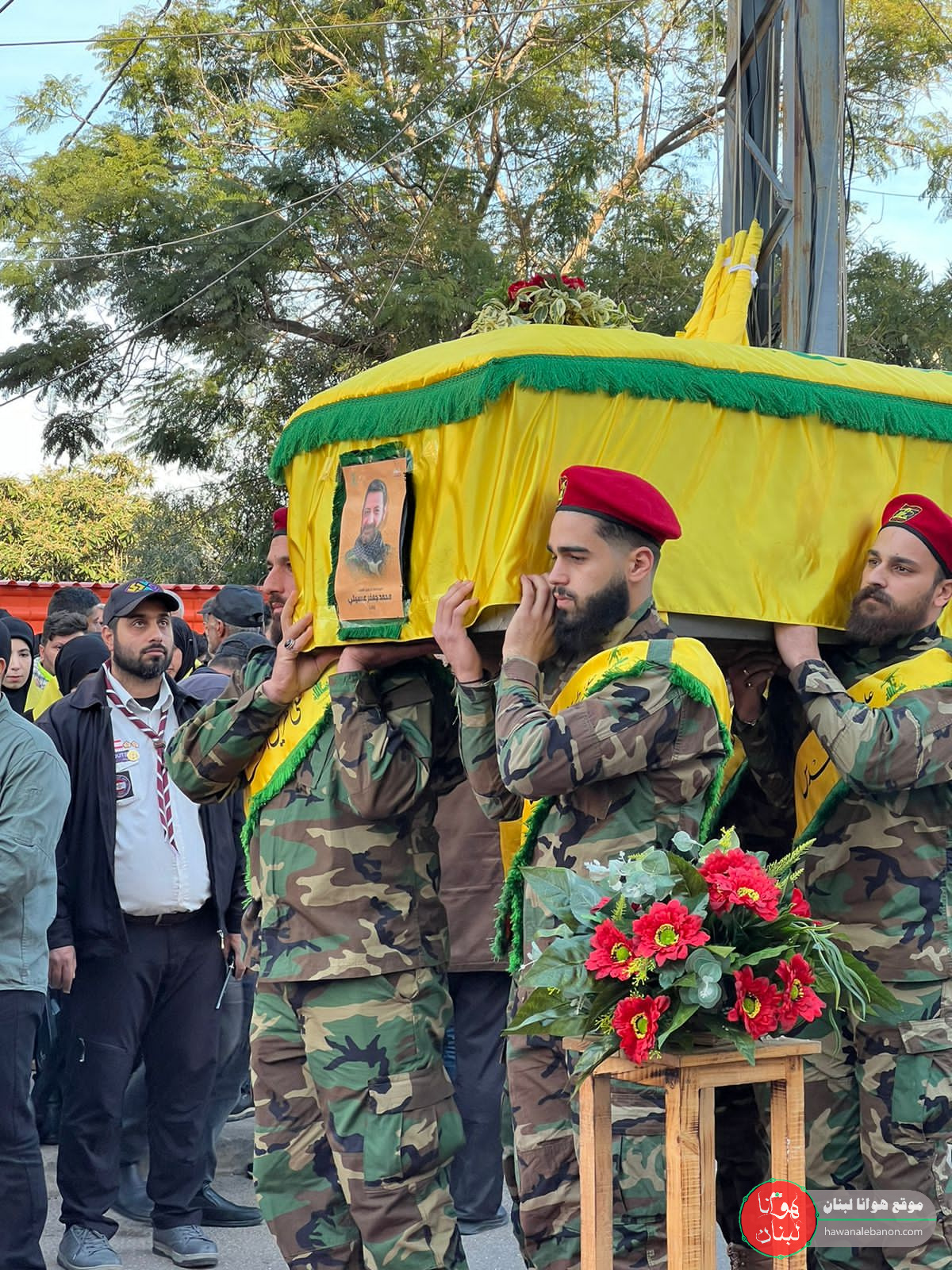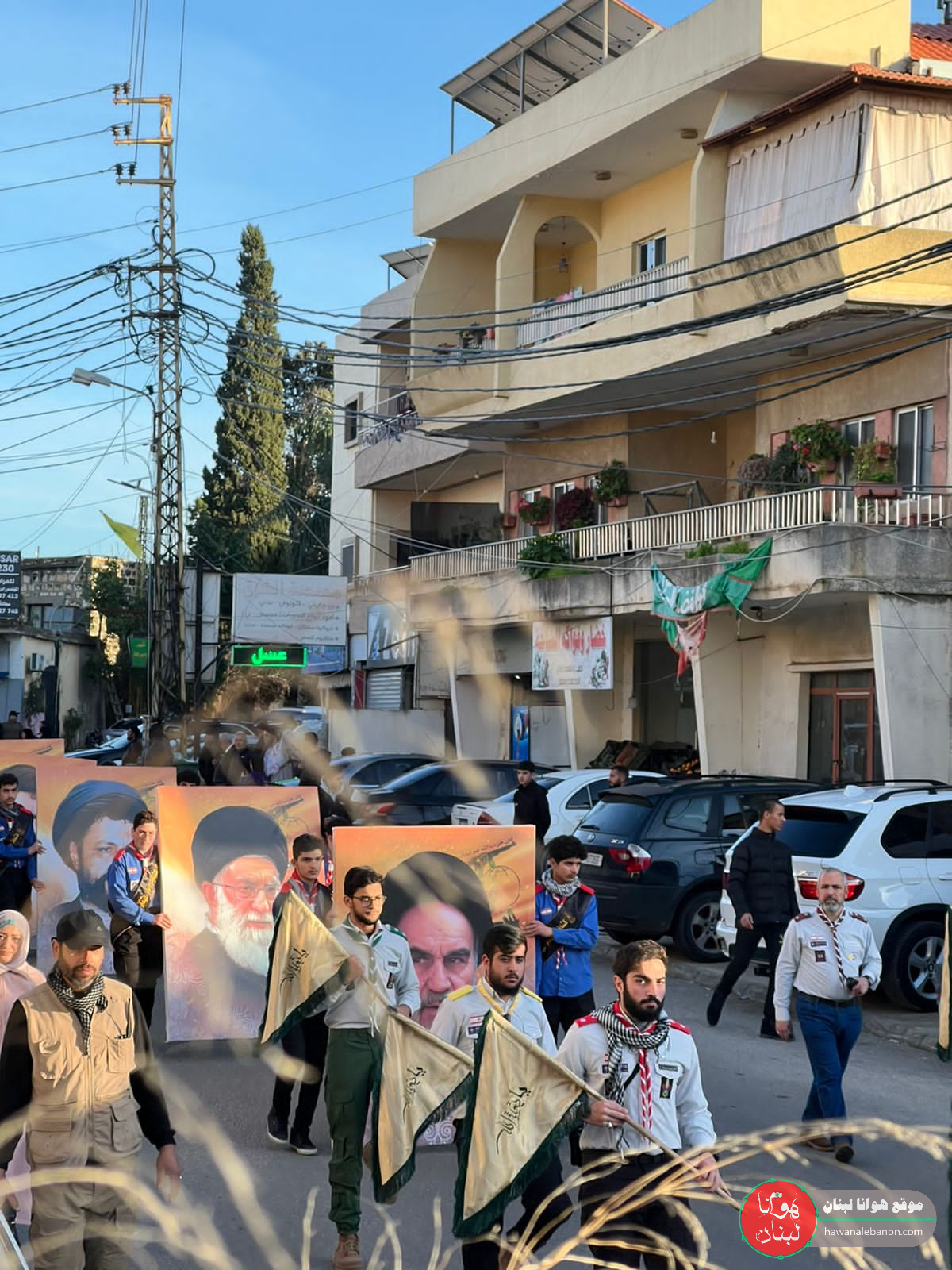 من مدخل البلدة انطلقت المراسم التكريمية حيث سُجِّيَ النعش على منصة خاصة وعزفت الفرقة الموسيقية في كشافة الامام المهدي لحن الشهادة ثم قدمت ثلة من المجاهدين قسم العهد والولاء بالمضيّ على خطى المقاومة والشهداء.