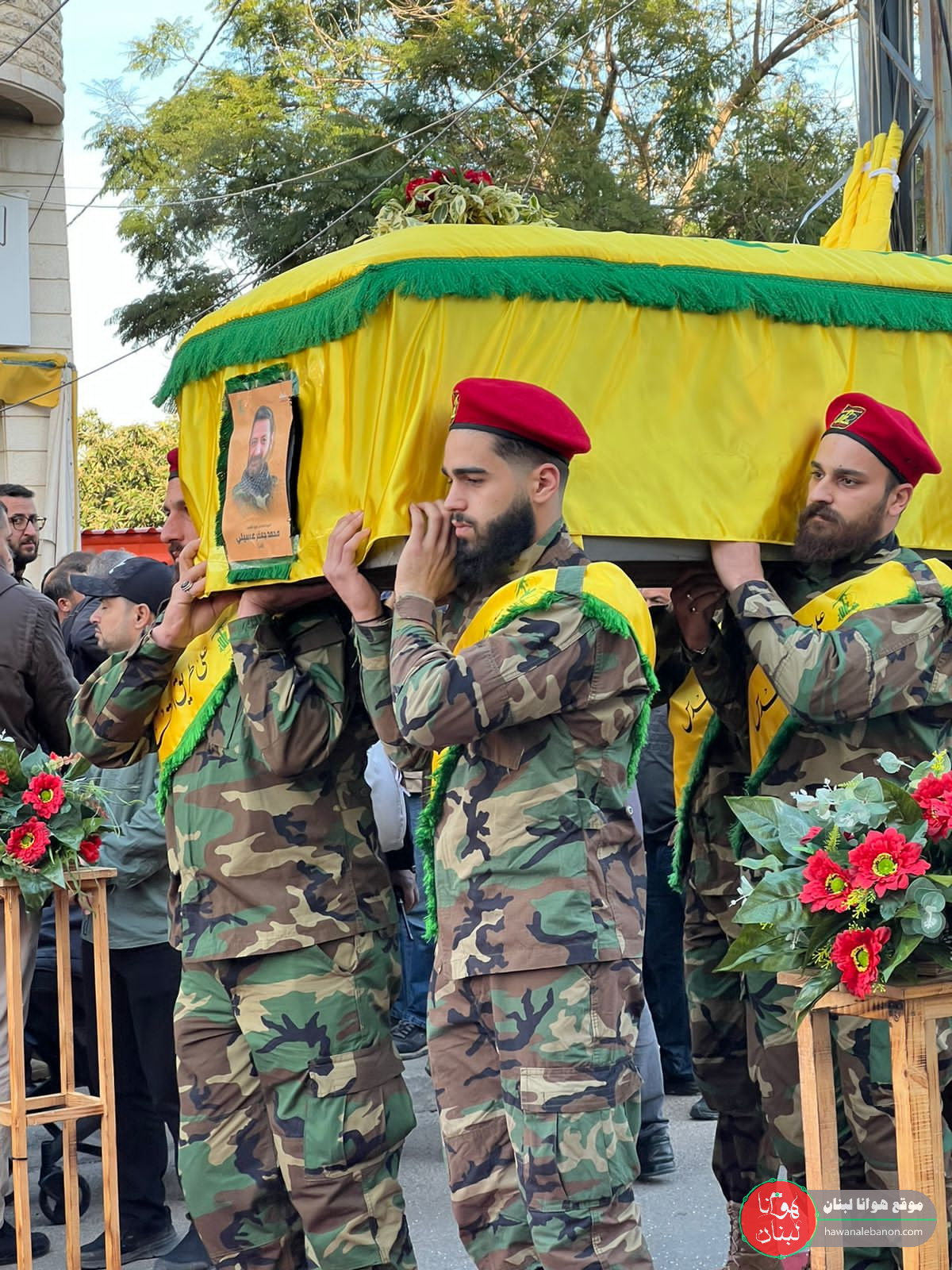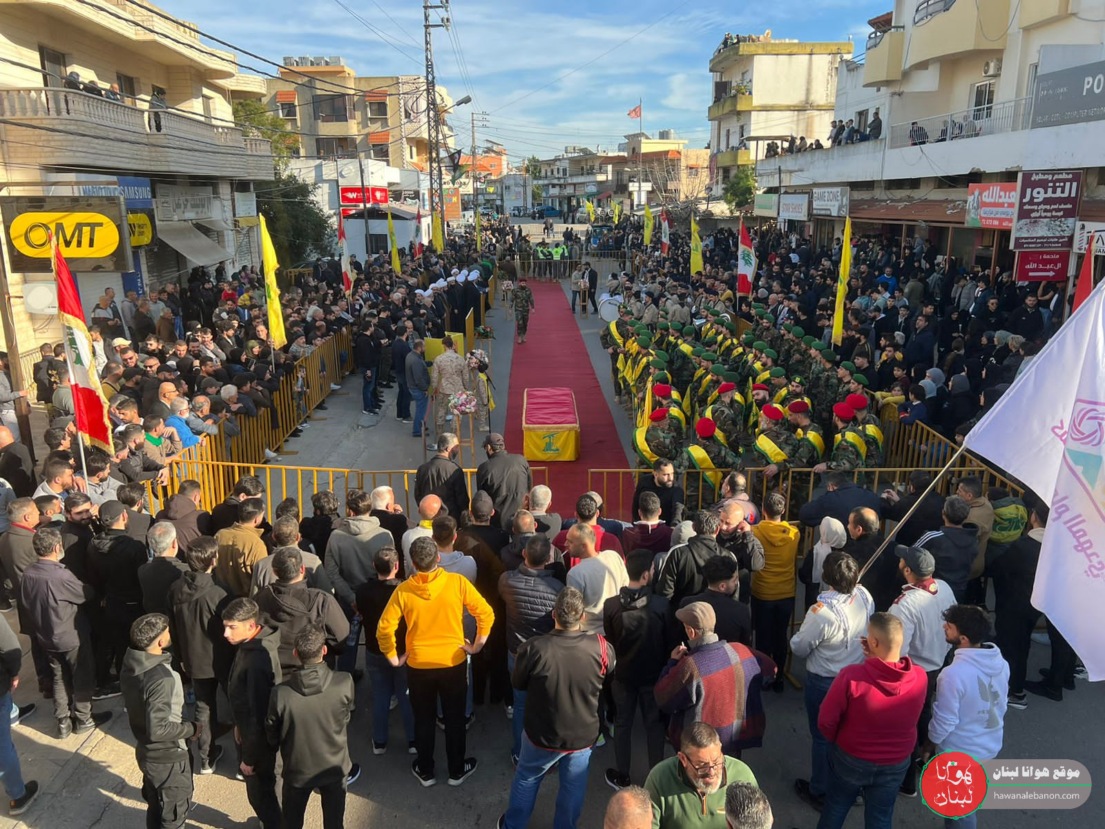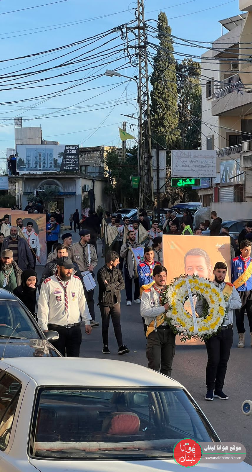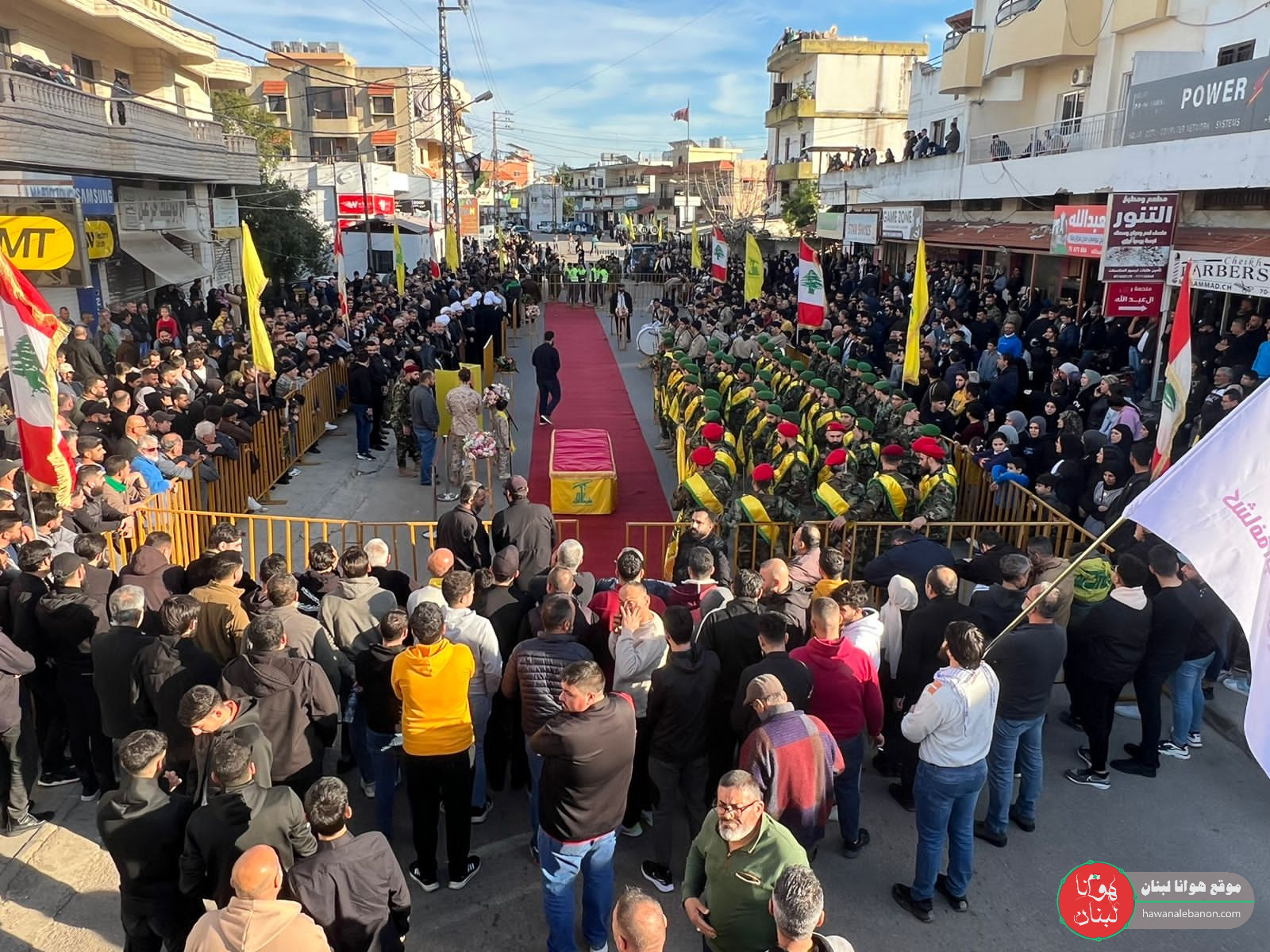 من مدخل البلدة انطلقت المراسم التكريمية حيث سُجِّيَ النعش على منصة خاصة وعزفت الفرقة الموسيقية في كشافة الامام المهدي لحن الشهادة ثم قدمت ثلة من المجاهدين قسم العهد والولاء بالمضيّ على خطى المقاومة والشهداء.