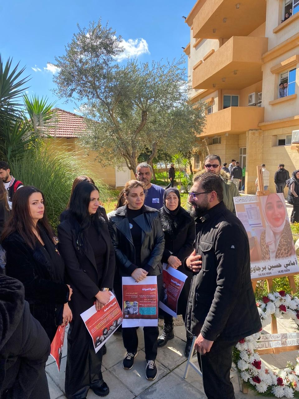 شارك في الوقفة ذوو الشهيدة، المدير الأكاديمي للجامعة الپروفسور حسّان خشفه، المدير الإداري الأستاذ وائل رباح، الدكتور محمد قانصو ، العمداء التنفيذيون وأساتذة الأقسام، زملاء الشهيدة من الكادر الإداري،