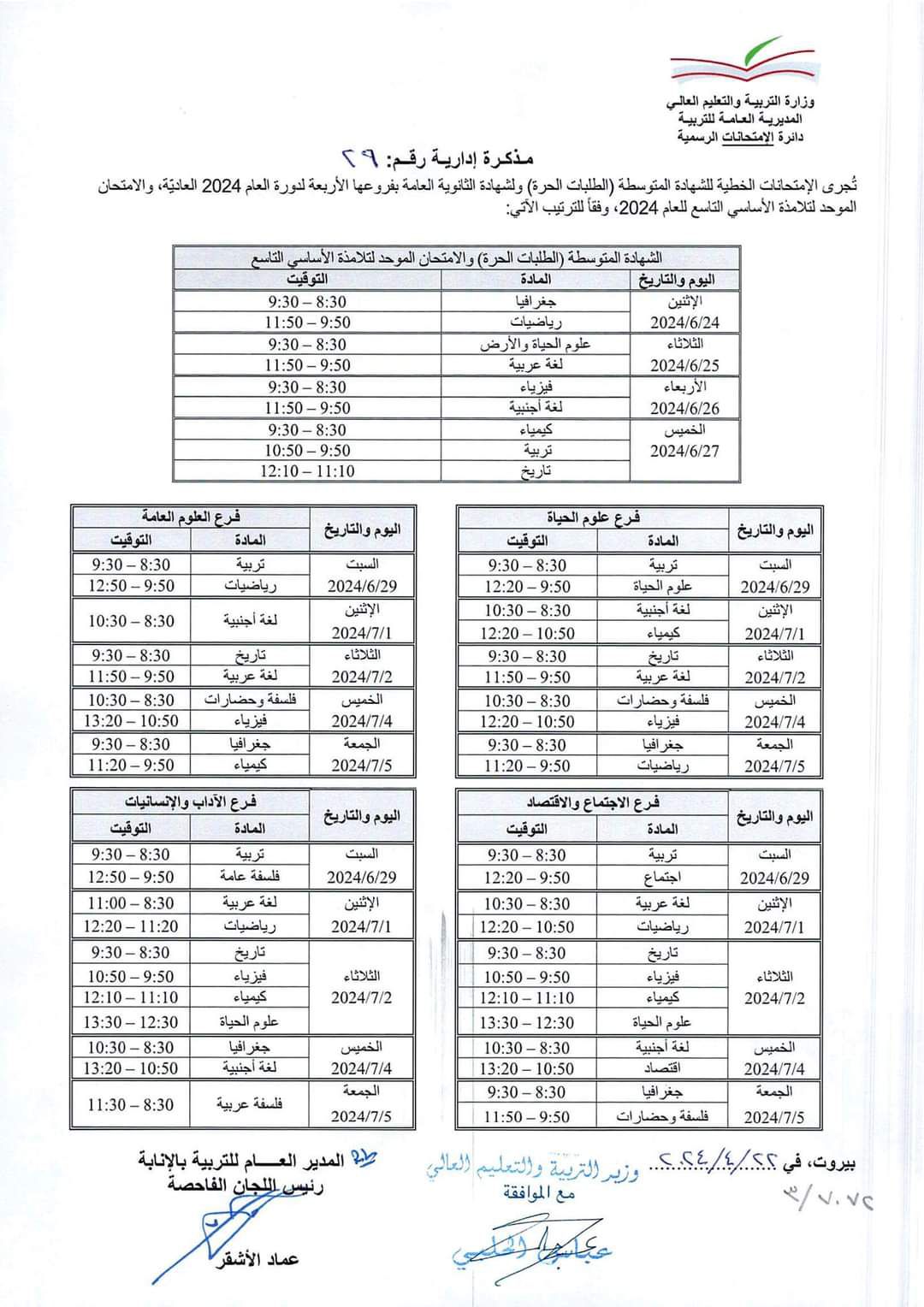 أصدرت وزارة التربية والتعليم العالي برنامج الإمتحانات الرسمية للشهادة المتوسطة (الطلبات الحرة)والثانوية بفروعها الأربعة والإمتحان الموحد لتلامذة الأساسي التاسع للعام 2024.
