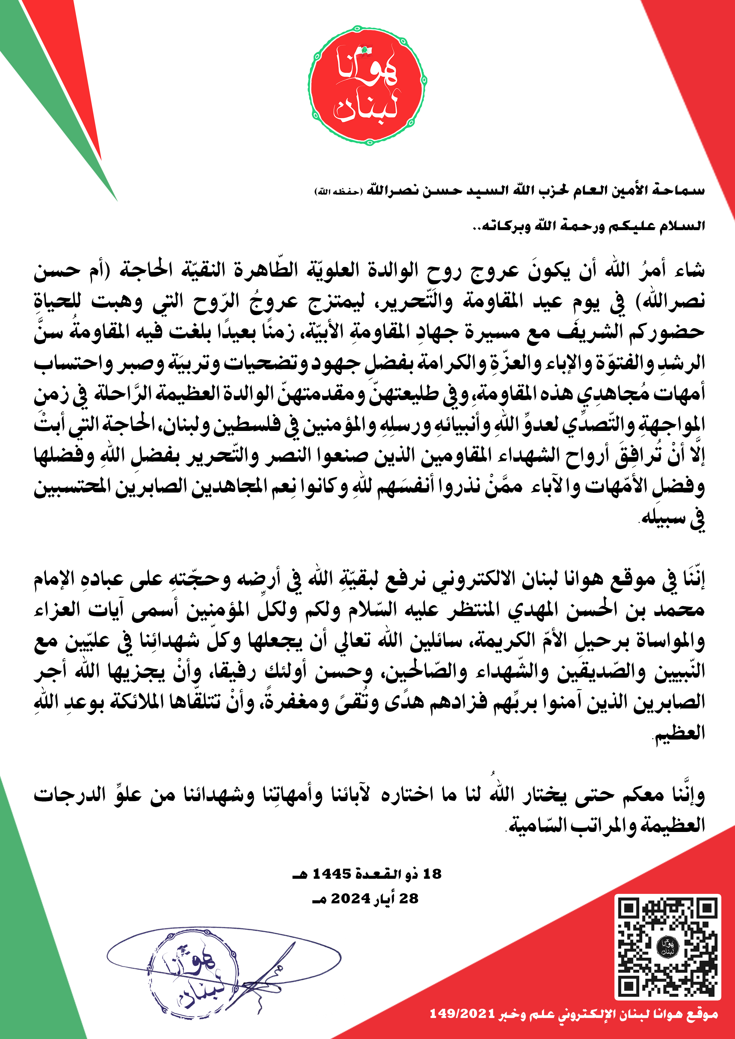 شاء أمرُ الله أن يكونَ عروج روحِ الوالدة العلويّة الطّاهرة النقيّة الحاجة (أم حسن نصرالله) في يومِ عيد المقاومة والتّحرير، ليمتزج عروجُ الرّوح التي وهبت للحياةِ حضوركم الشريف مع مسيرة جهادِ المقاومةِ الأبيّة، زمنًا بعيدًا بلغت فيه المقاومةُ سنَّ الرشدِ والفتوّة والإباء والعزّةِ والكرامة بفضلِ جهود وتضحيات وتربيَة وصبر واحتساب أمهات مُجاهدِي هذه المقاومة،ِ وفي طليعتهنّ ومقدمتهنّ الوالدة العظيمة الرَّاحلة في زمنِ المواجهةِ والتّصدِّي لعدوِّ اللهِ وأنبيائهِ ورسلِهِ والمؤمنين في فلسطين ولبنان، الحاجة التي أبتْ إلَّا أنْ تُرافِقَ أرواح الشهداء المقاومين الذين صنعوا النصر والتّحرير بفضلِ اللهِ وفضلها وفضلِ الأمّهات والآباء ممَّنْ نذروا أنفسَهم للهِ وكانوا نِعم المجاهدين الصابرين المحتسبين في سبيله.